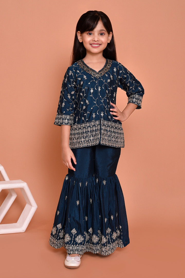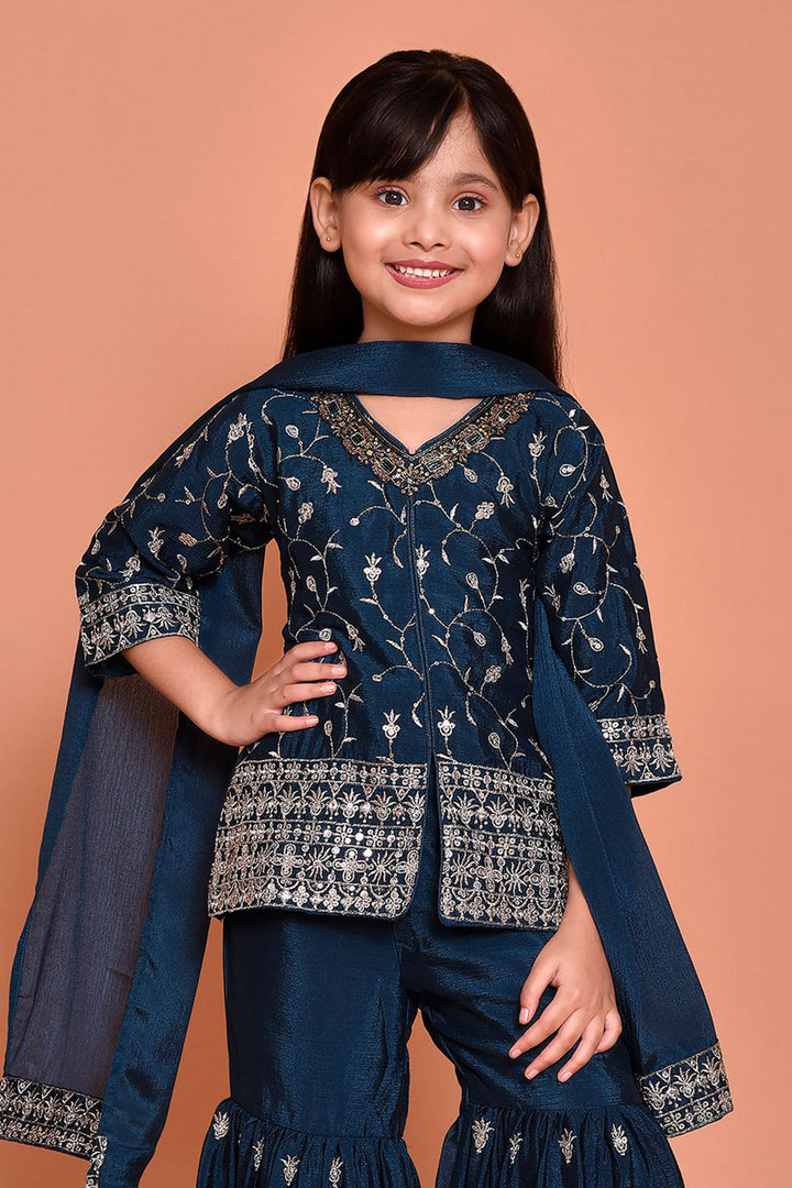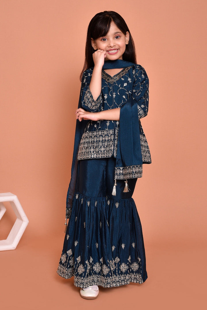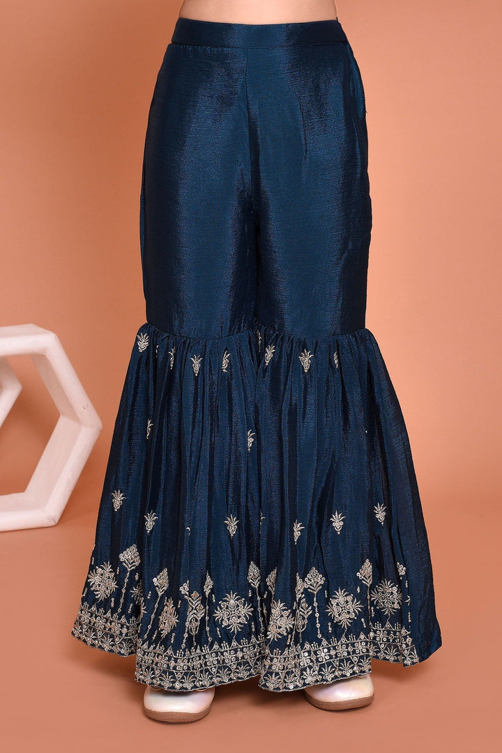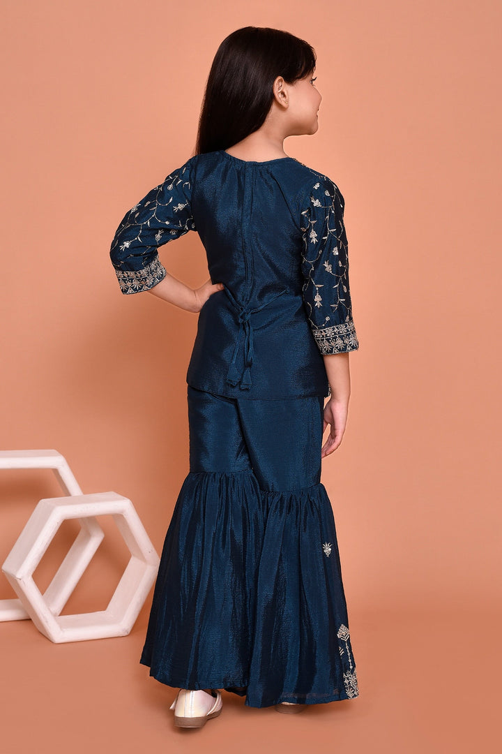 Blue Polyester Embroidered Zari Work Kurta Gharara Set