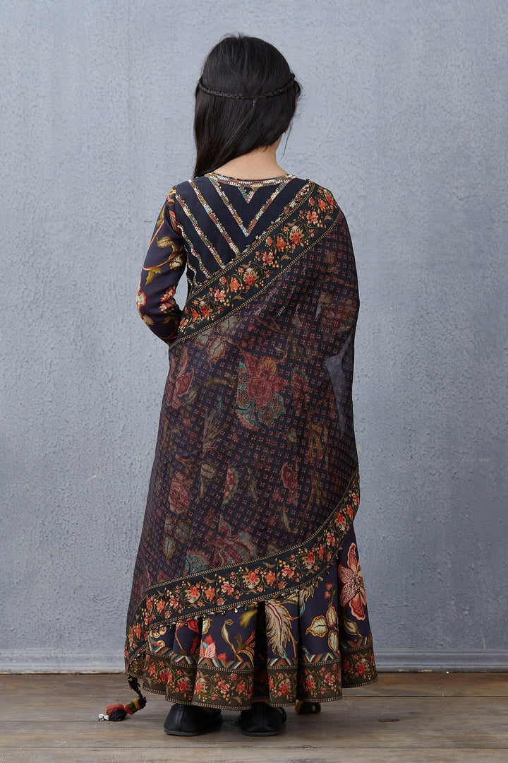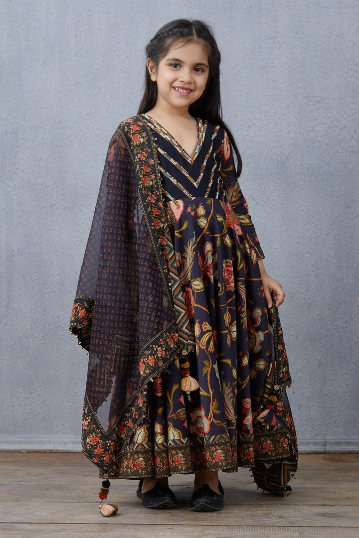 Blue anarkali kurta with all-over multi-color floral motif work & placement sequin worked bodice. Comes with silk organza tassel dupatta.