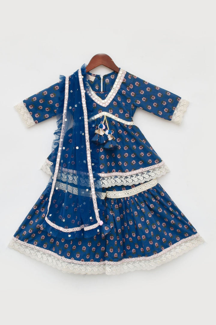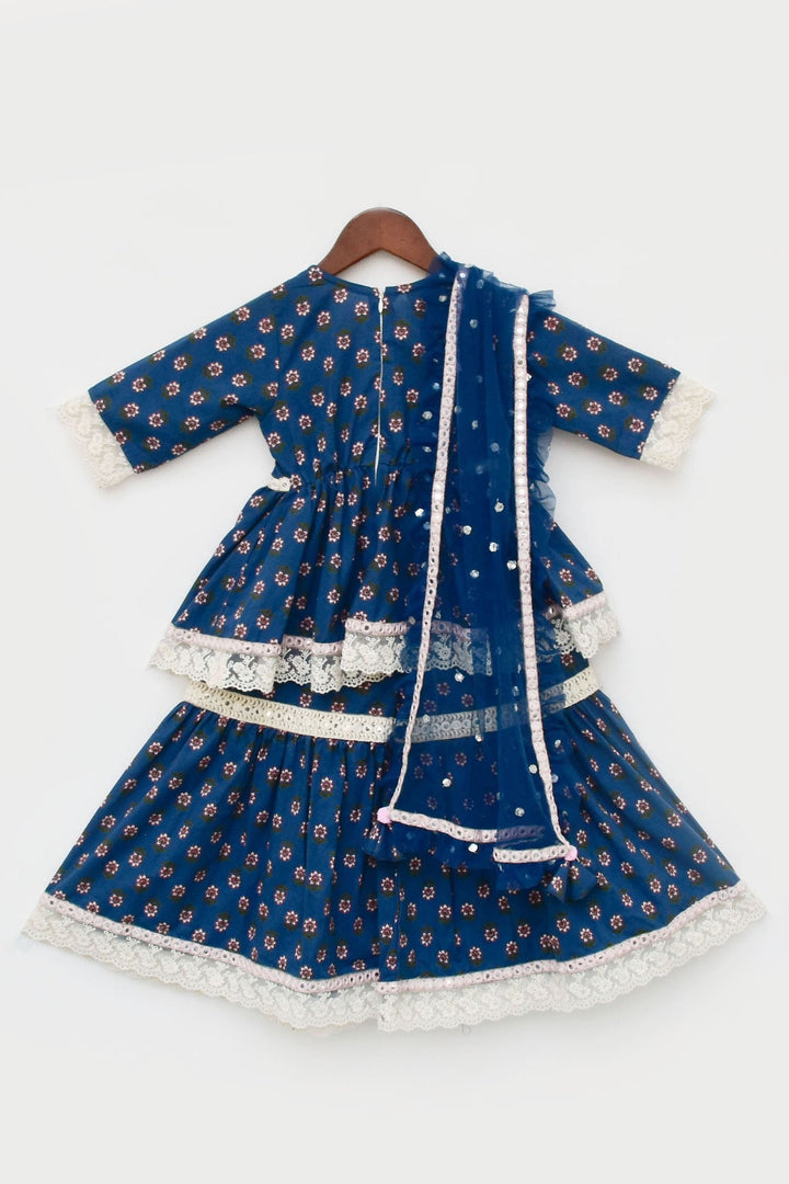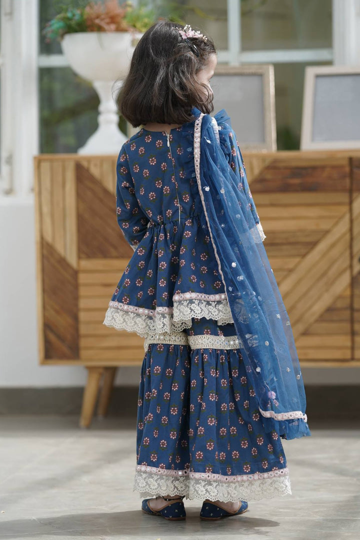 Blue Cotton Printed Floral Motifs Kurta Sharara Set For Girls