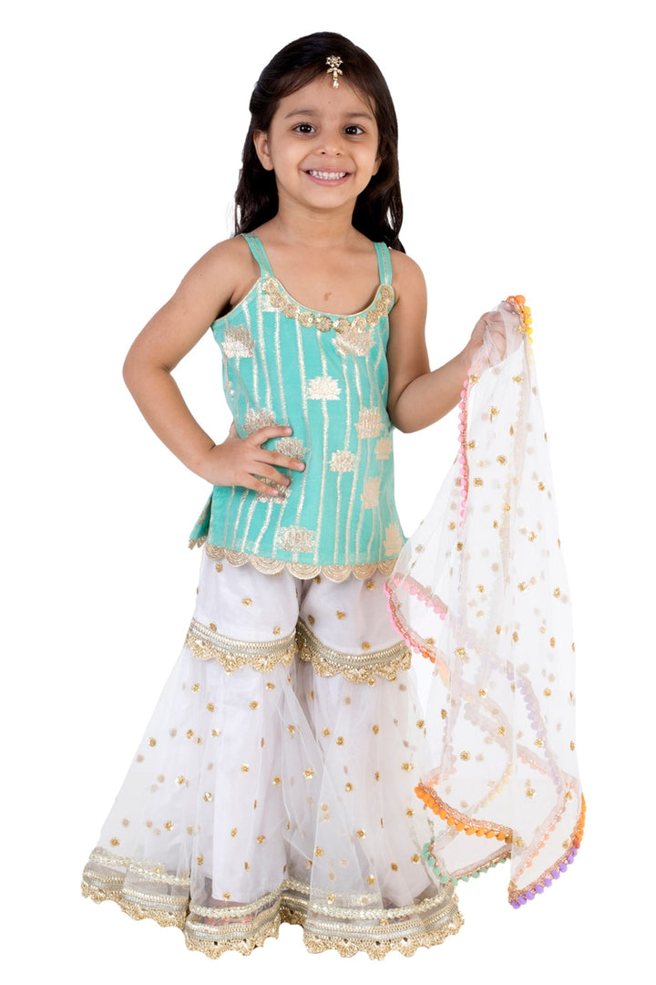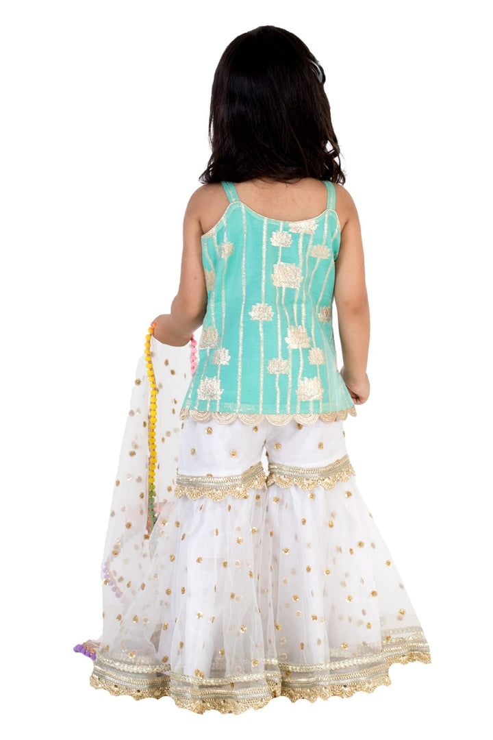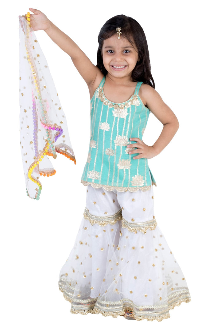 Blue Chanderi Cotton Embroidered Sequins Lotus Print Kurta Sharara Set For Girls