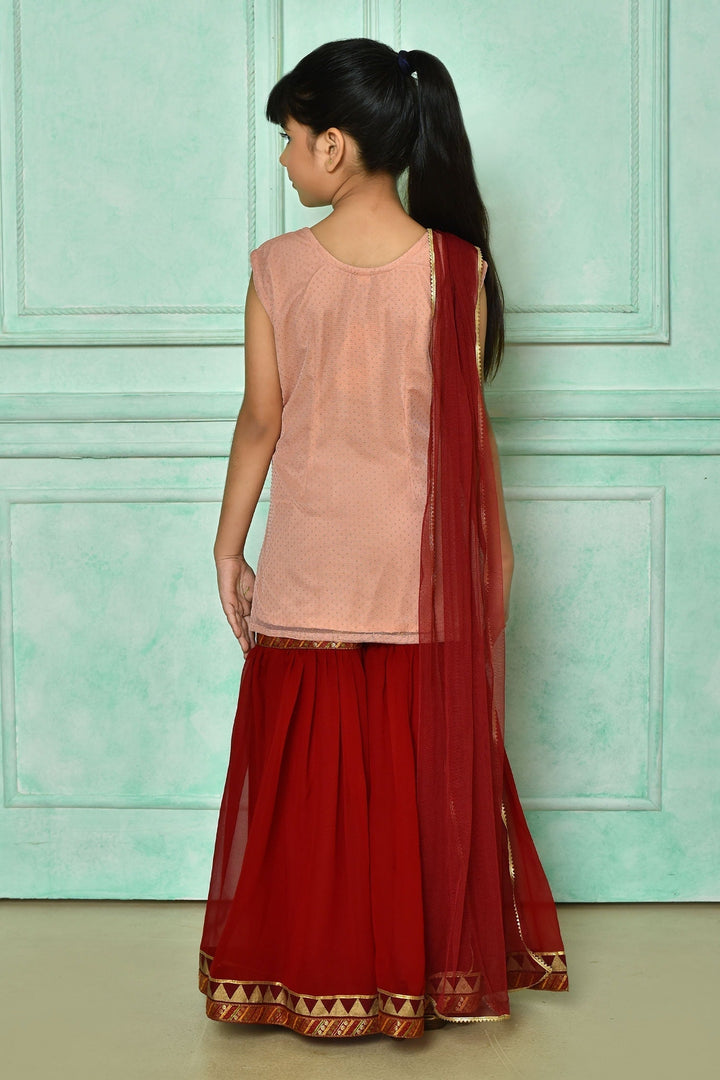 Peach Kurta And Dupatta: Net Embroidered Gota Work Gharara Set For Girls