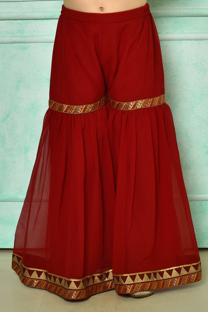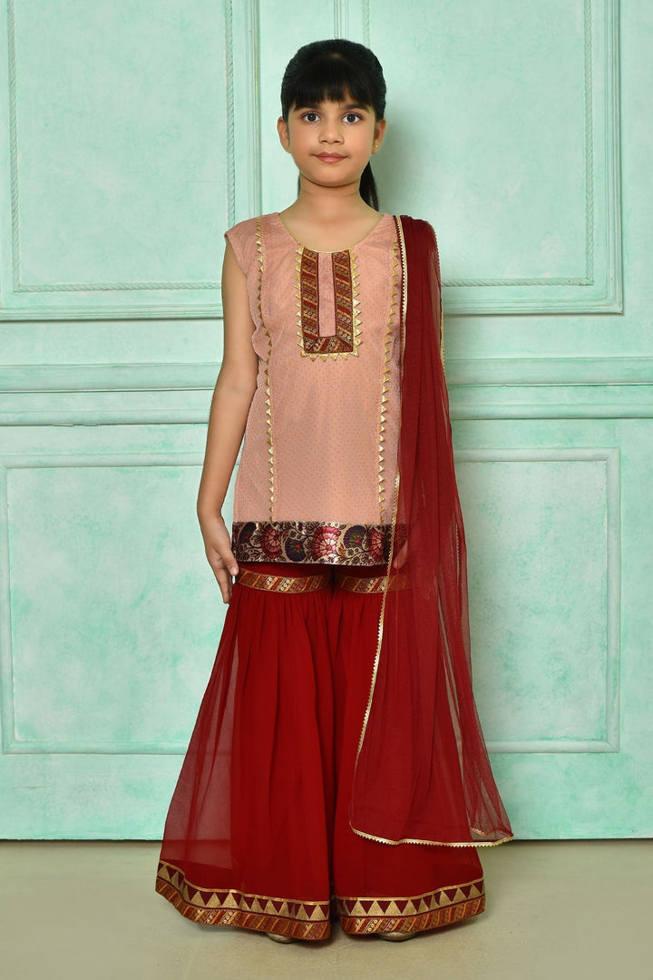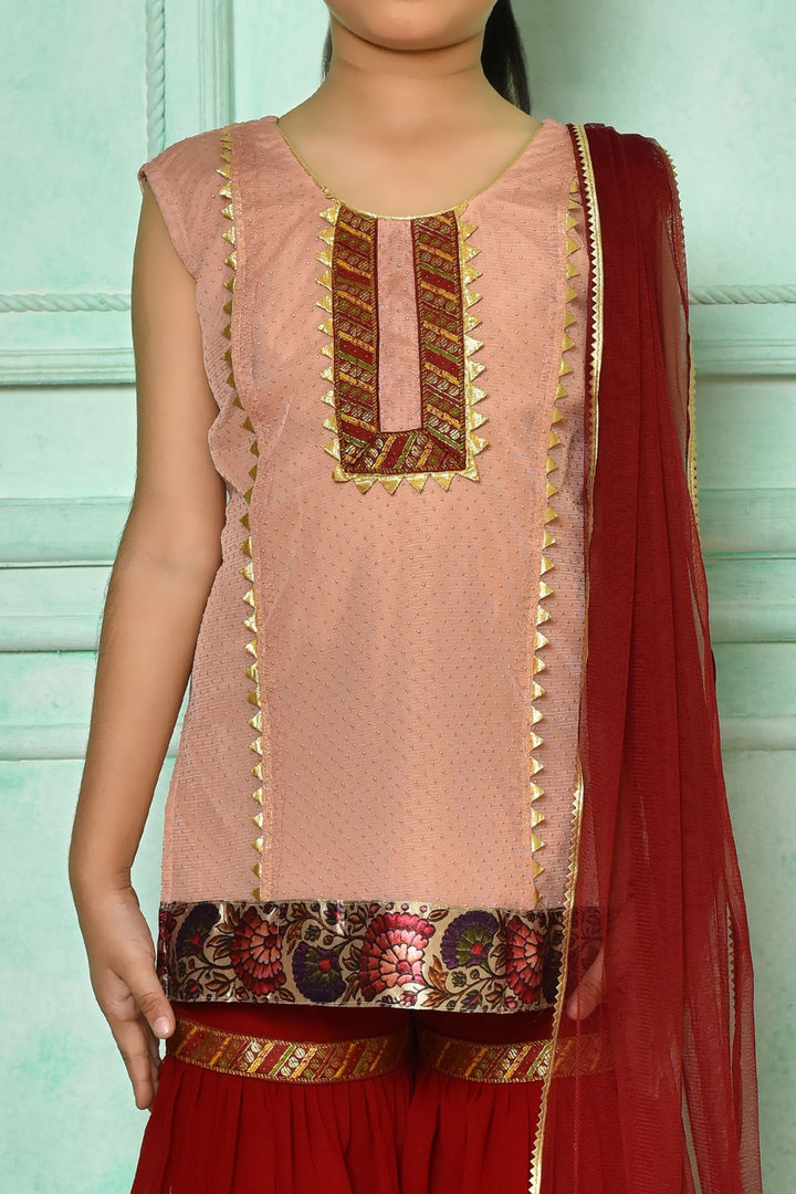 Peach kurta with gota work & floral pattern border. Comes with maroon gharara & dupatta.