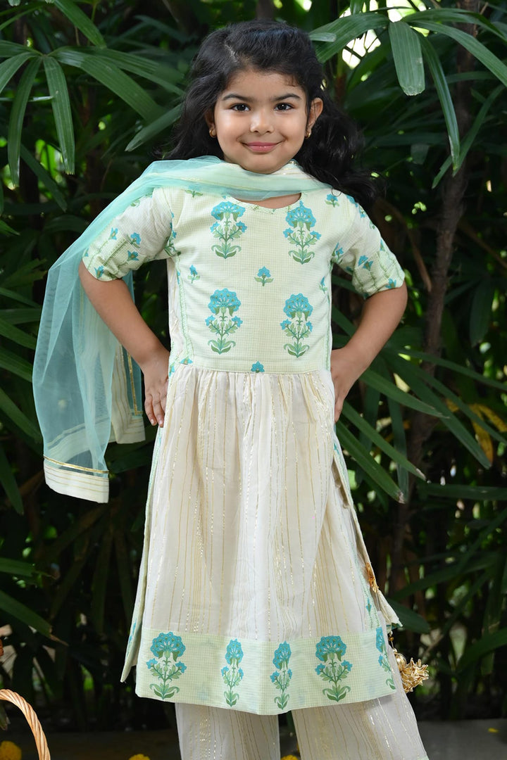 Ivory Cotton Floral Pattern Long Kurta Pant Set For Girls