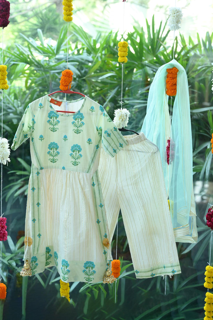 Ivory and teal blue long kurti in hand block floral pattern. Paired with a pant and net dupatta.