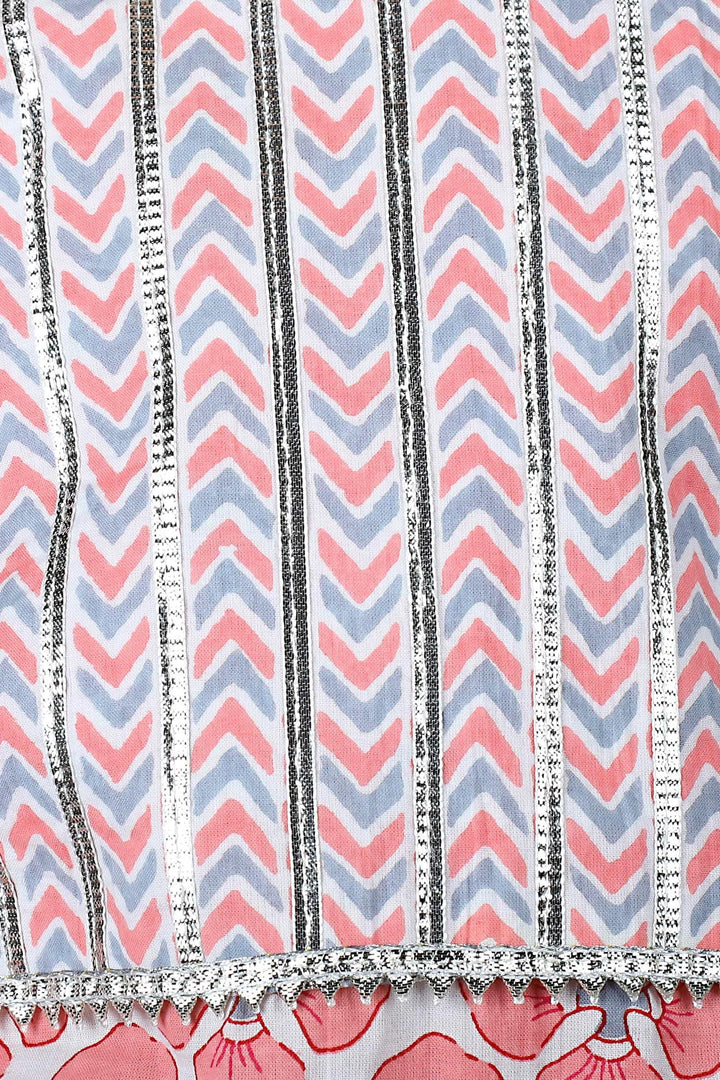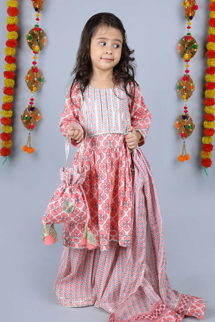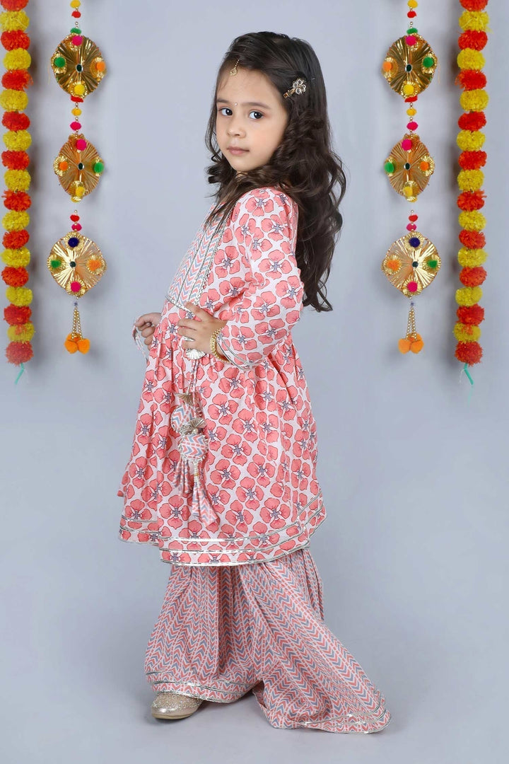 Pink Cotton Floral And Gota Patti Kurta Sharara Set For Girls