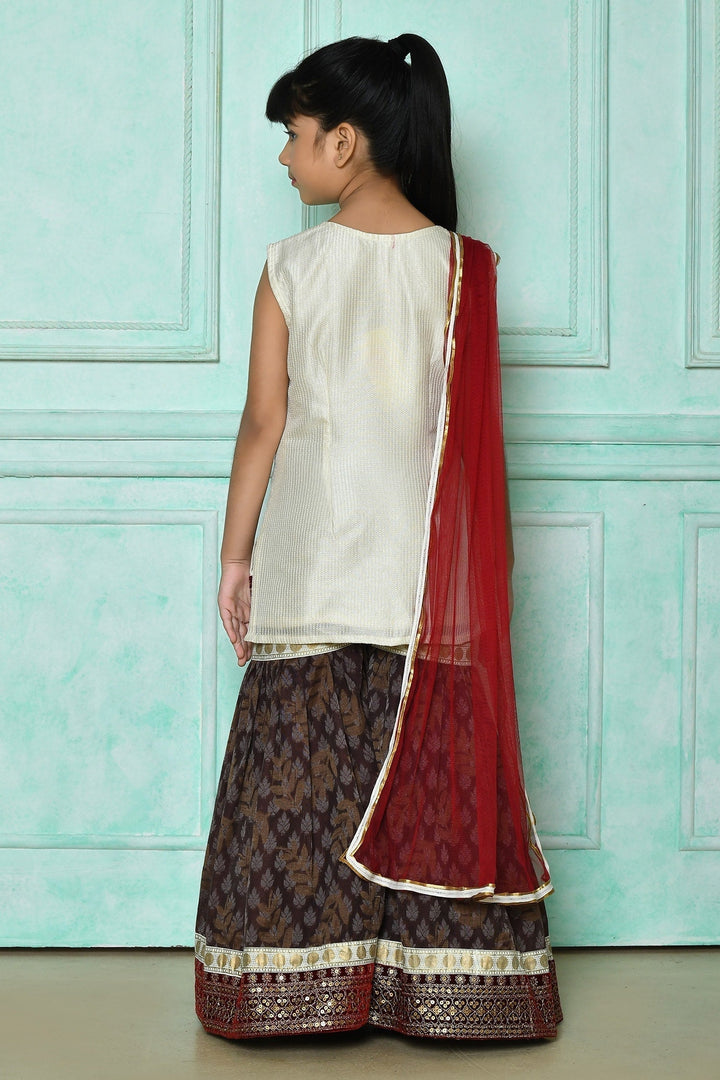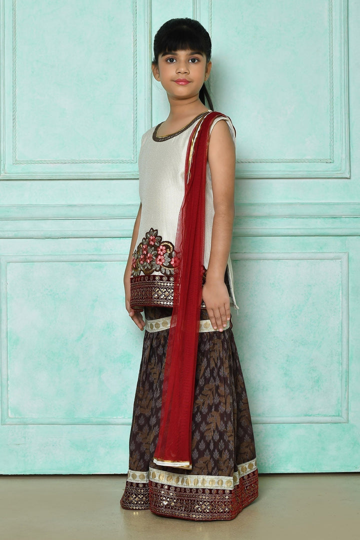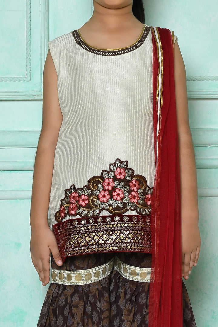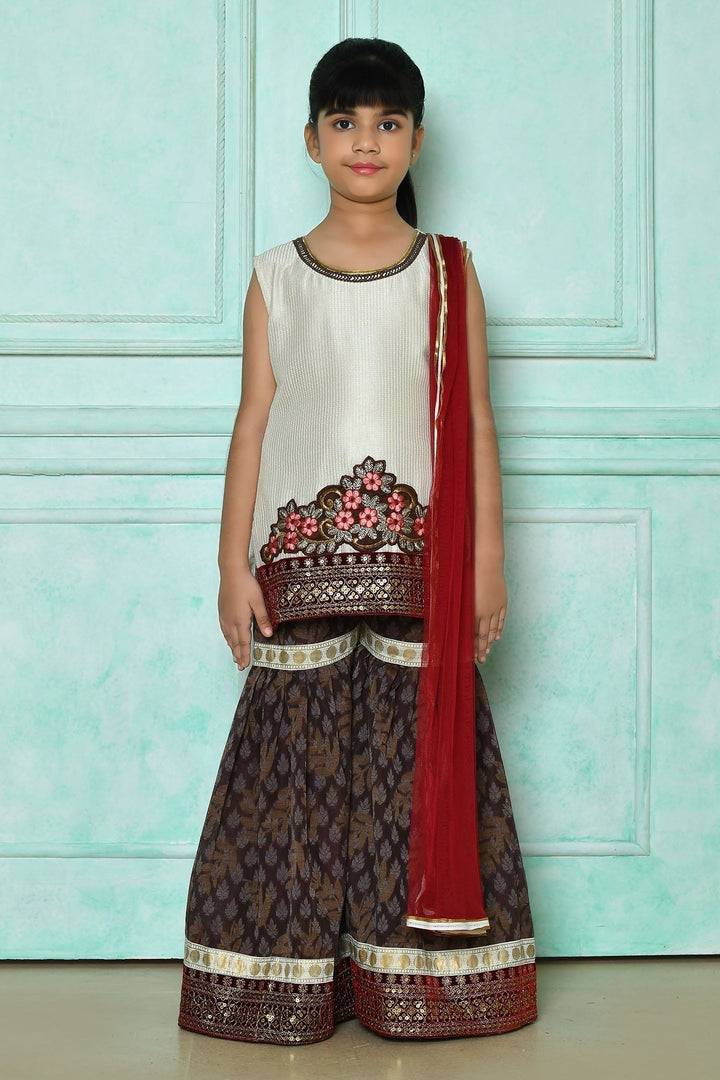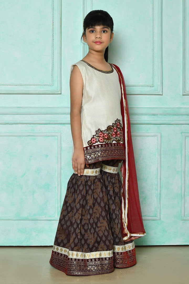 Off White Kurta: Art Silk Embroidered Floral Pattern Gharara Set For Girls