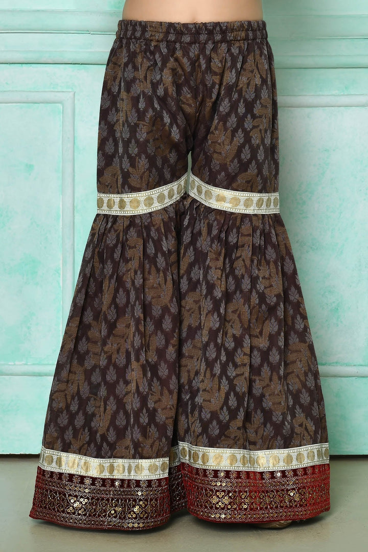Off white straight kurta with floral embroidery. Comes with brown gharara & maroon dupatta.