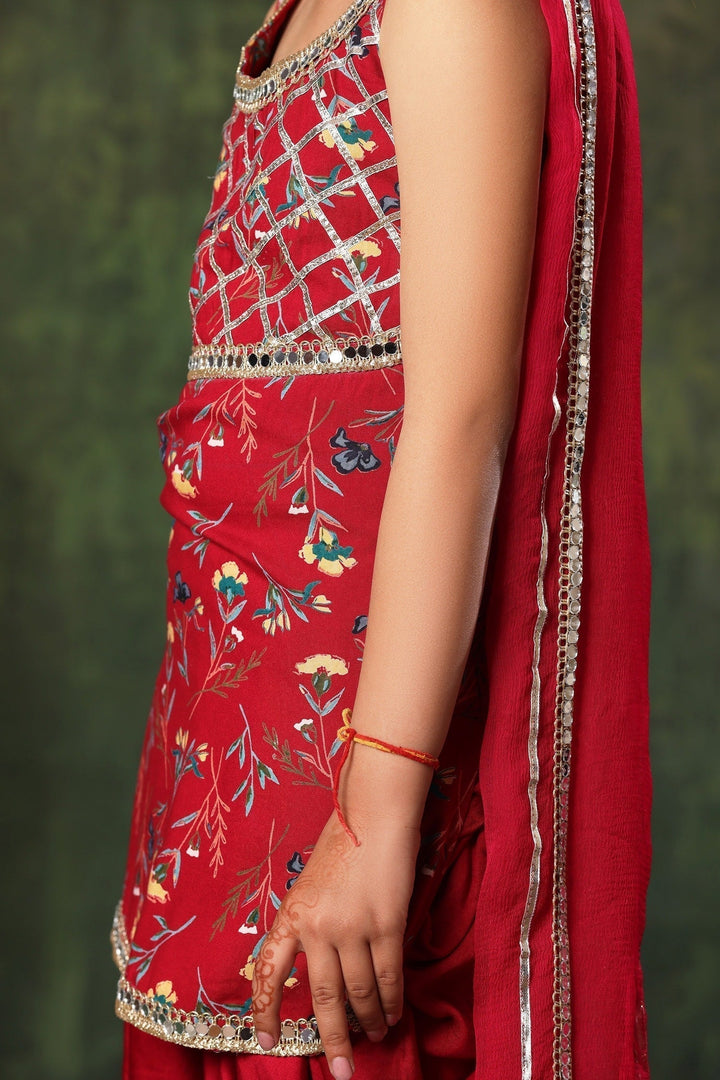 Peach Cotton Viscose Linen Embroidered Floral Work Kurta Sharara Set For Girls