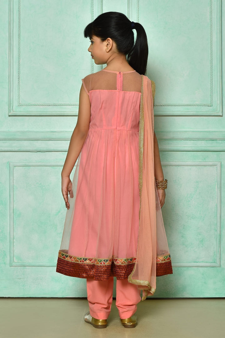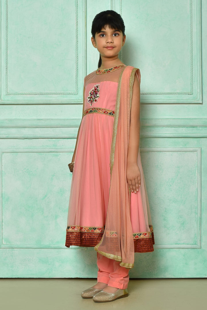 Pink Net Embroidered Floral Sheer Neckline Anarkali Set For Girls