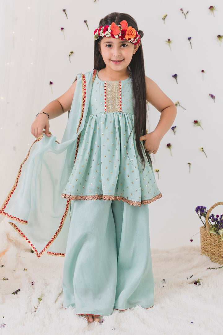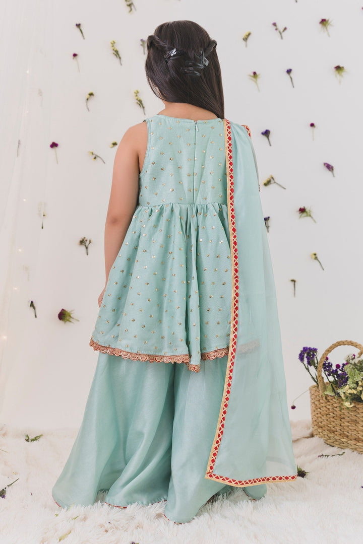 Green Silk Embroidered Sequin Work Peplum Kurta Sharara Set For Girls