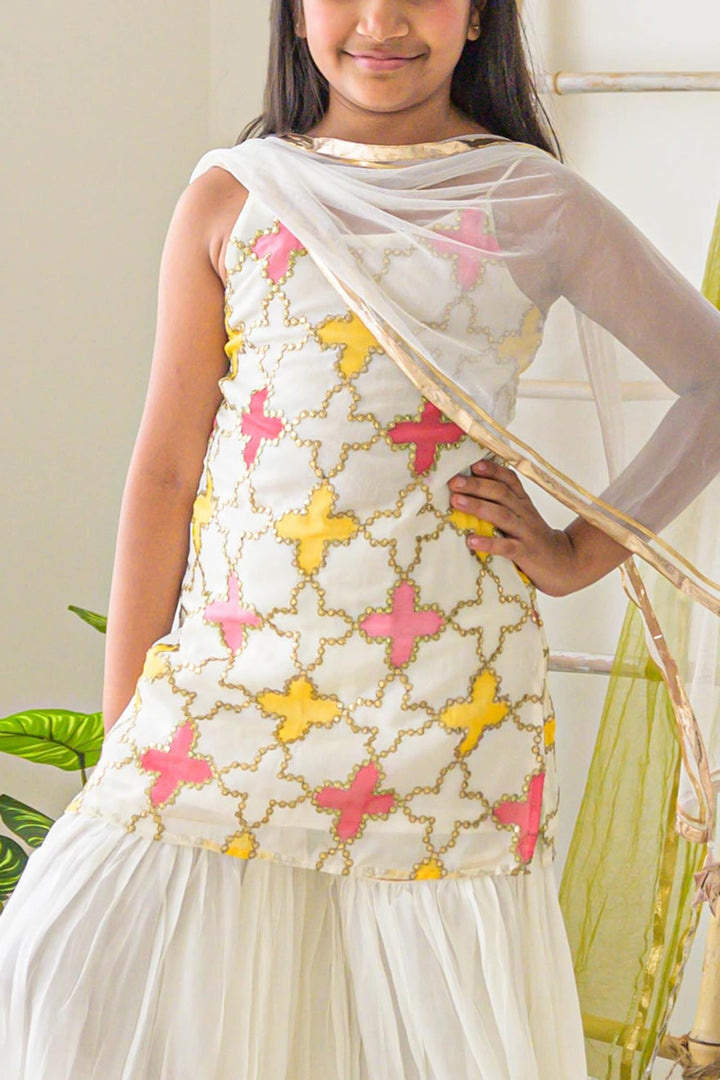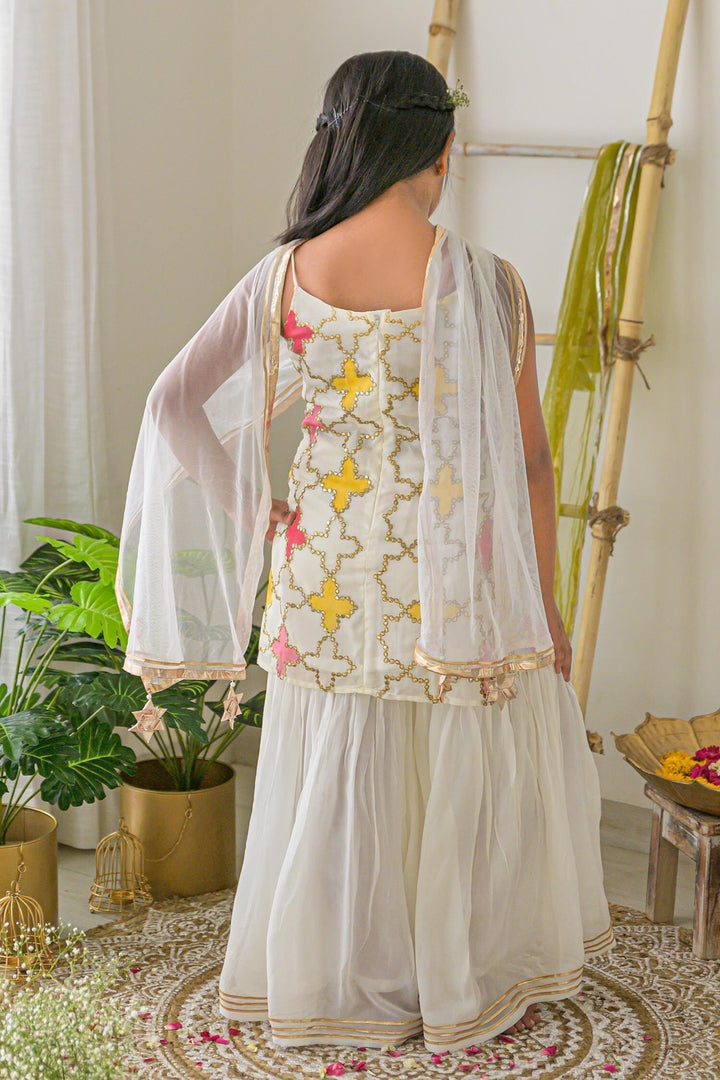 White Georgette Embroidered Gota Work Geometric Kurta Sharara Set For Girls