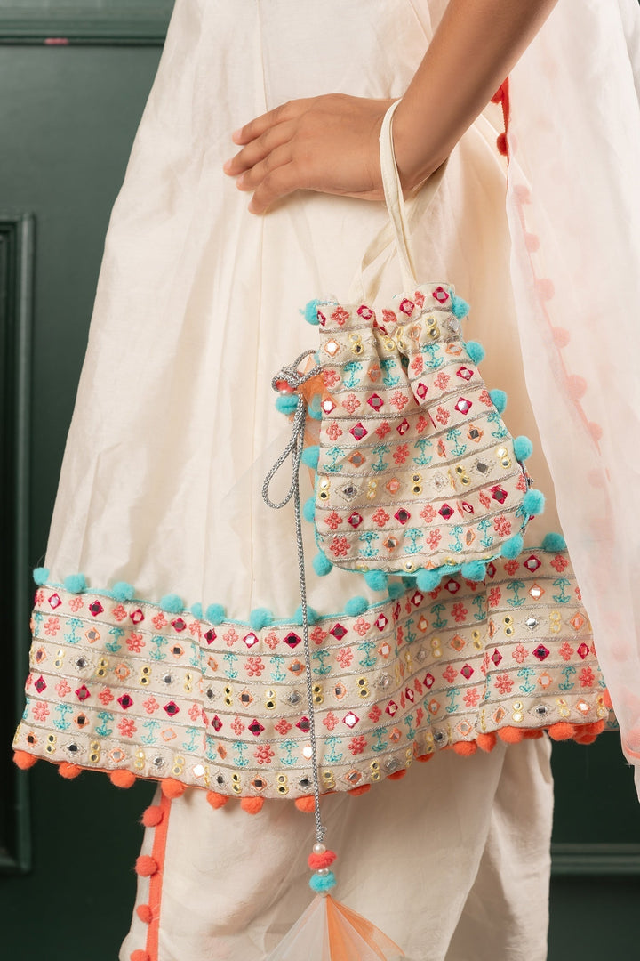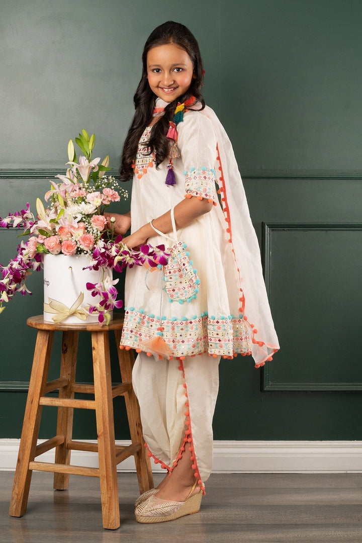 Off White Pure Chanderi Silk Embroidered Mirror Kurta Dhoti Pant Set For Girls