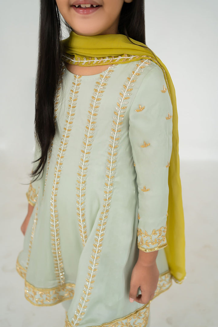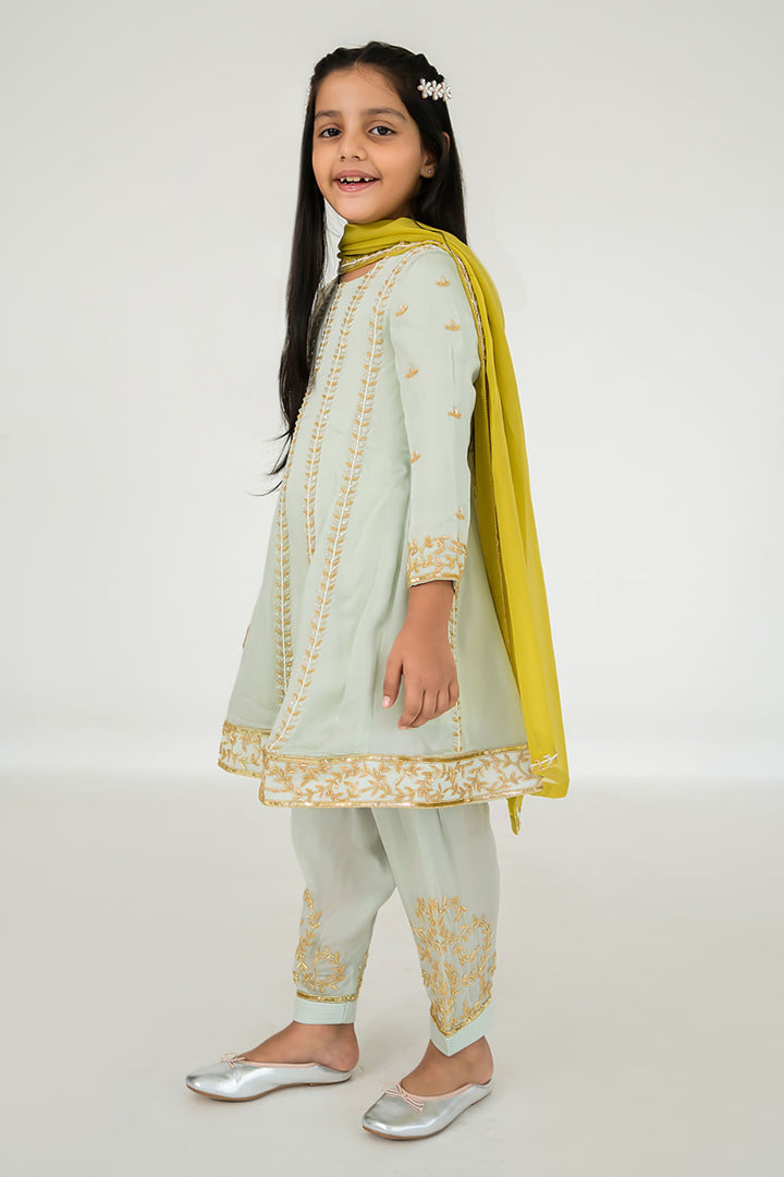 Light mint anarkali with leaf vine embroidery. Paired with an embroidered salwar and dupatta.