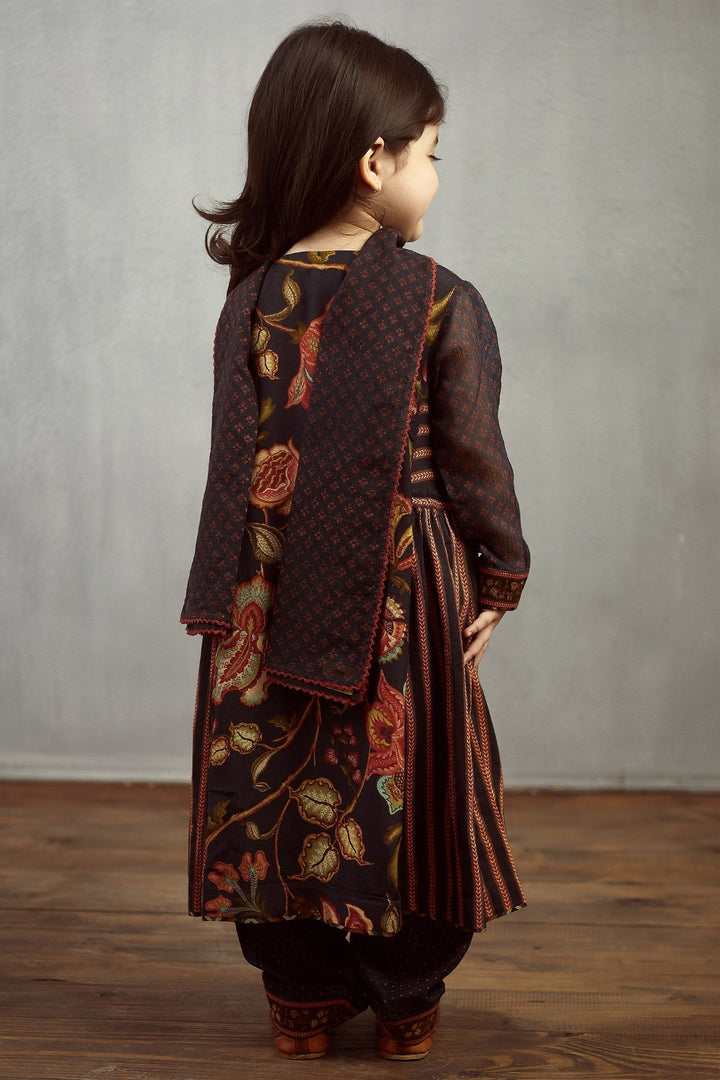 Black kurta with all over floral and striped print. Comes with polka dotted pant and dupatta.