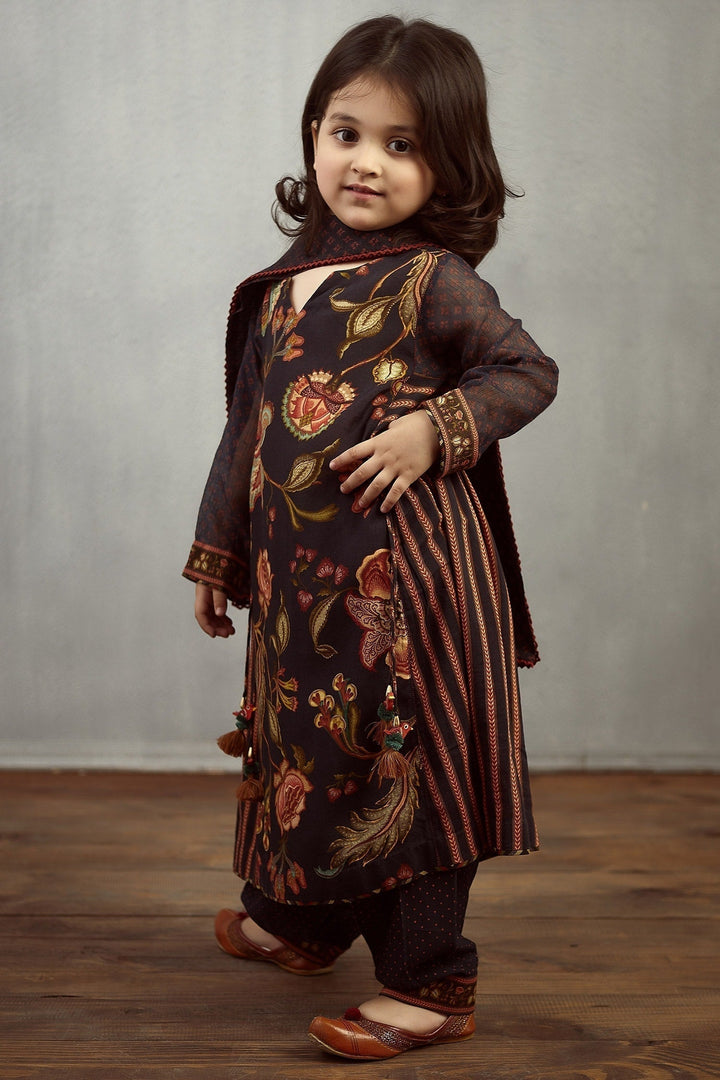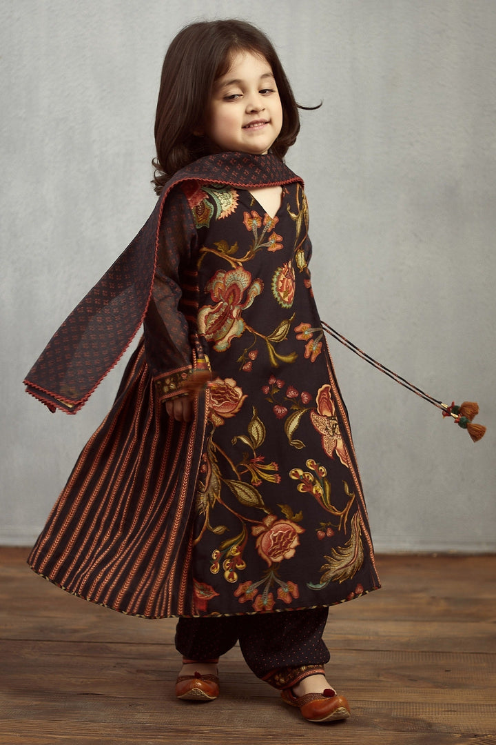 Black Cotton Silk Chanderi Printed Kurta Set For Girls