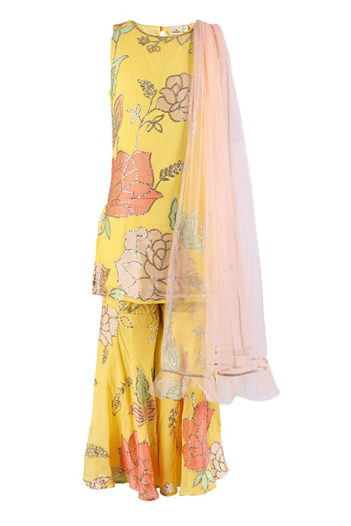 Yellow kurta with floral embroidered motifs. Paired with sharara & dupatta.