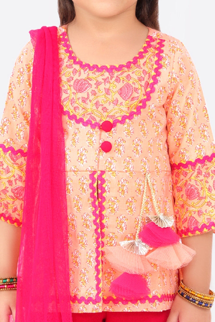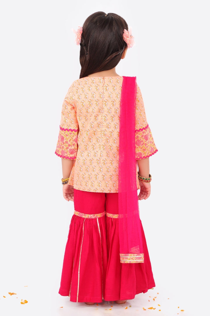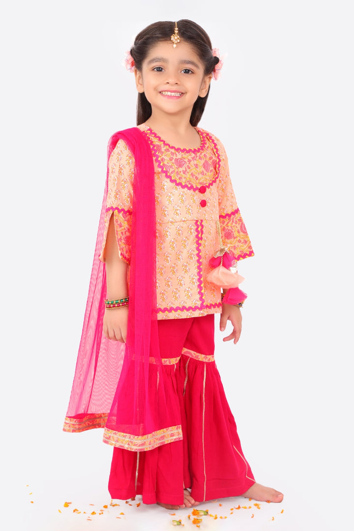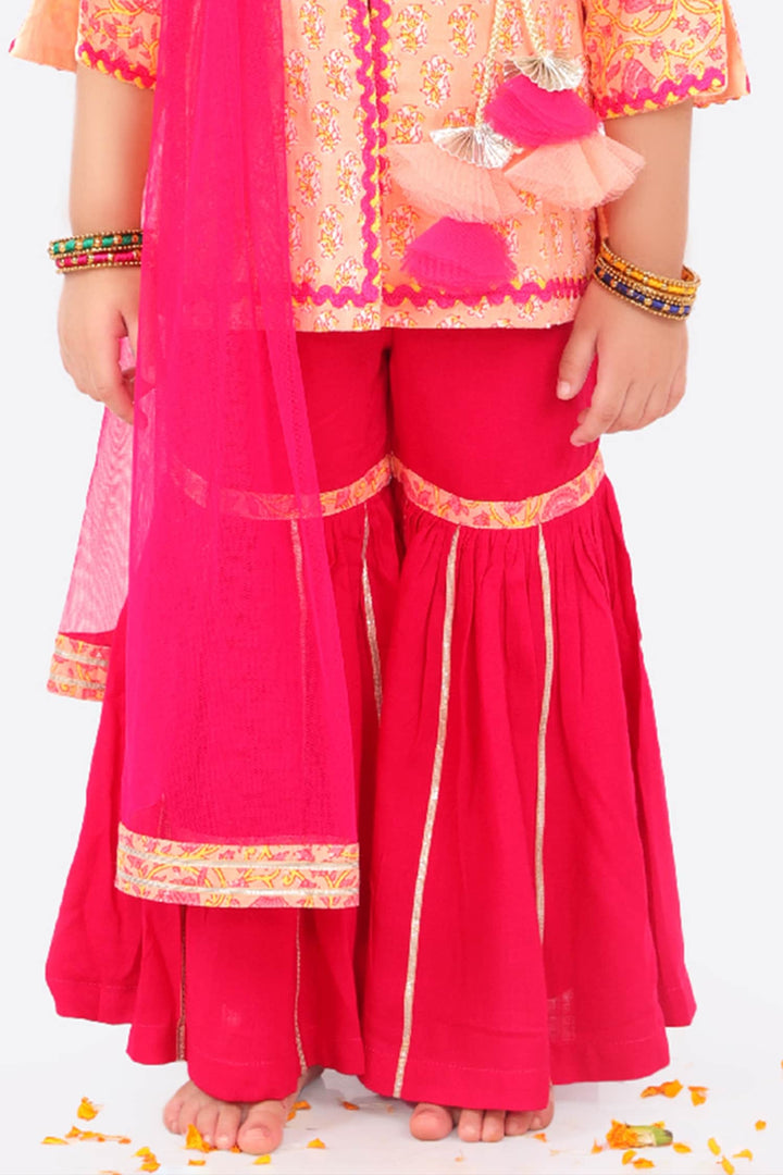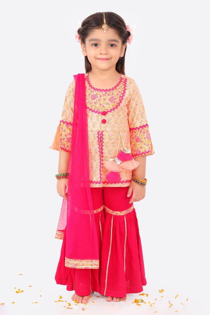 Orange kurta with all-over floral print, round neckline, front slit & lace detail. Comes with fuchsia pink sharara & dupatta.