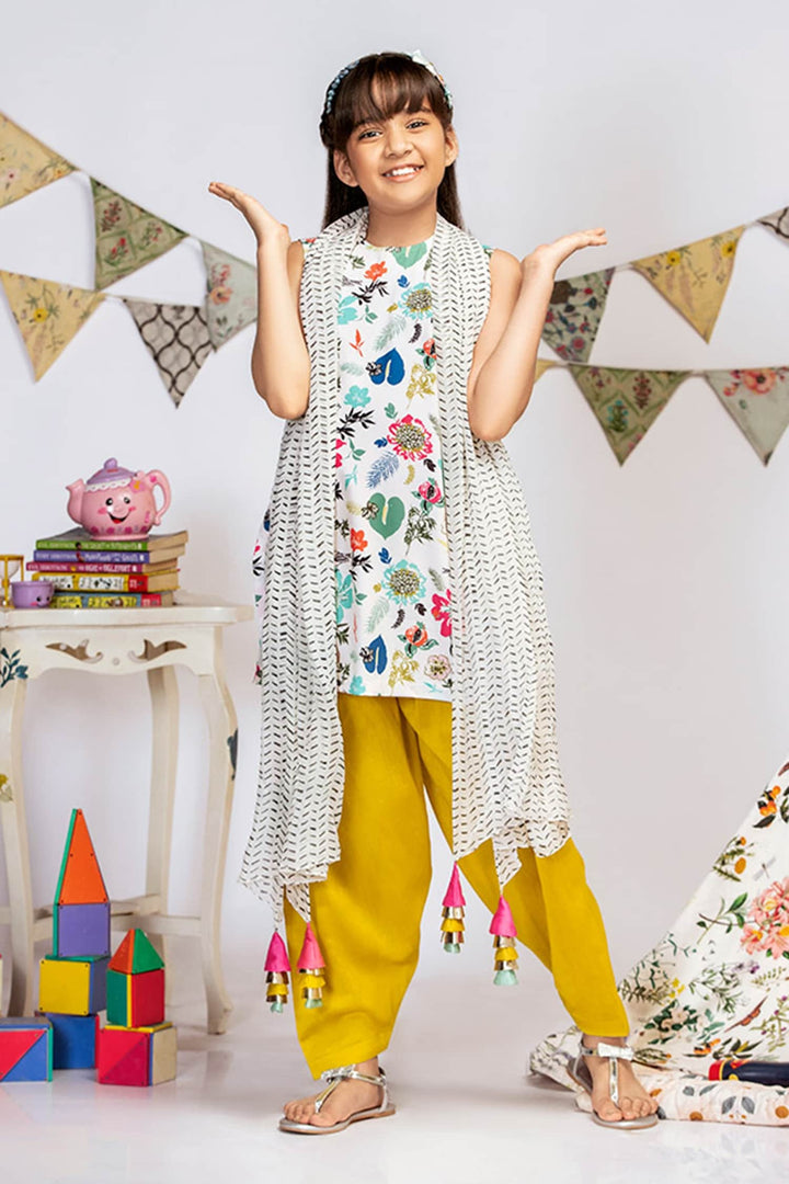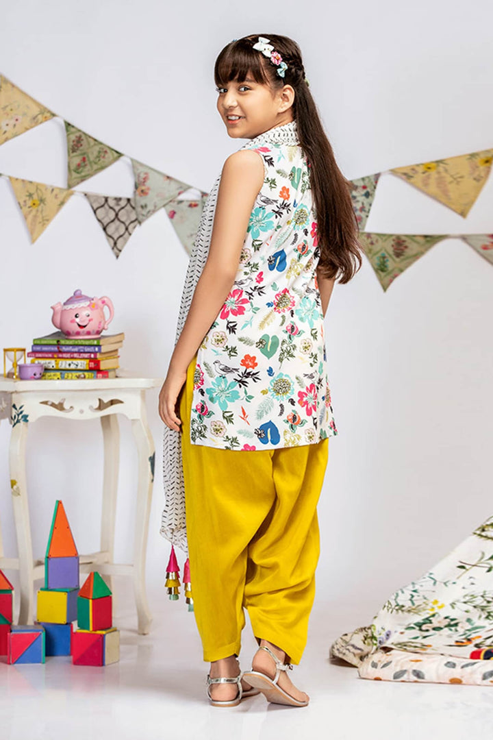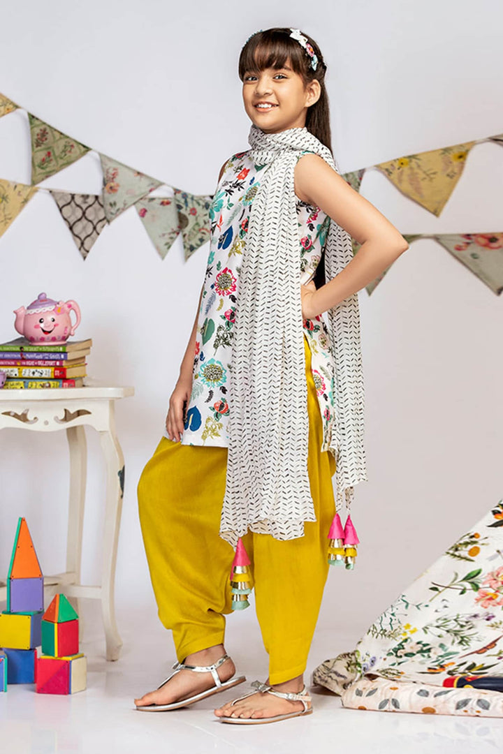 Cream Crepe Floral Kurta And Salwar Set For Girls