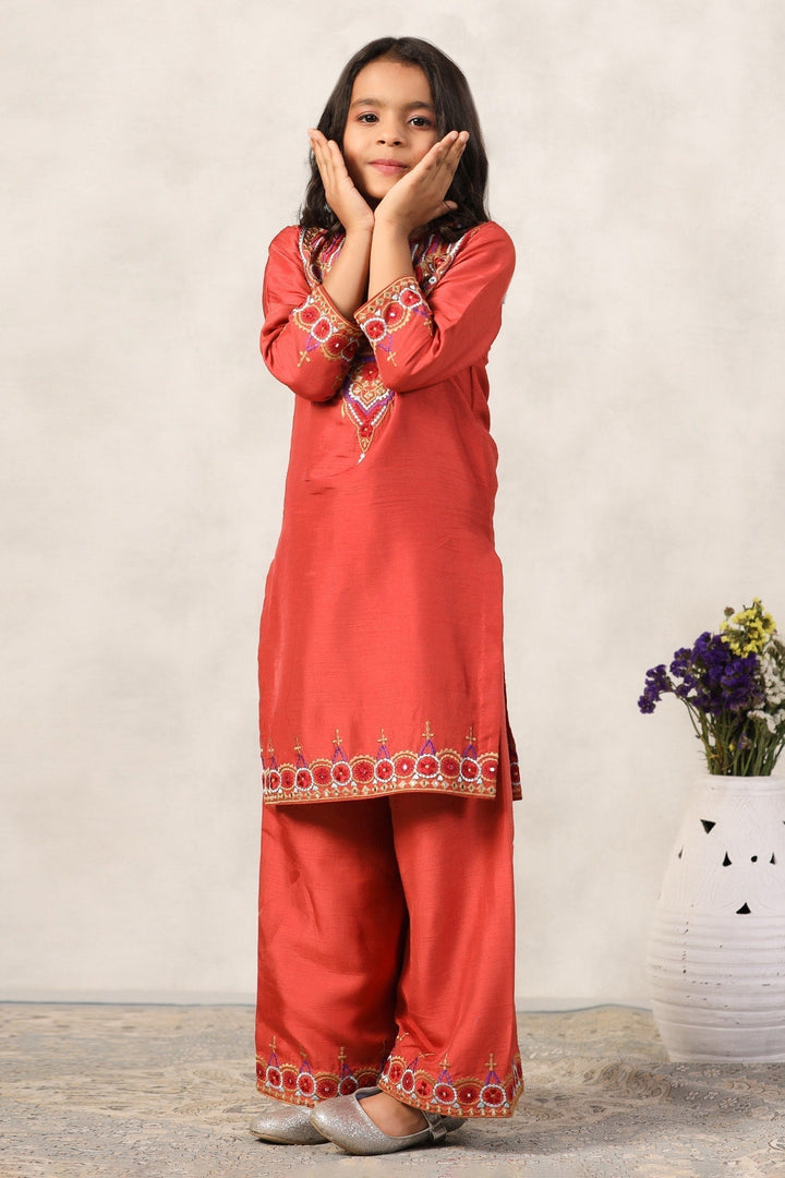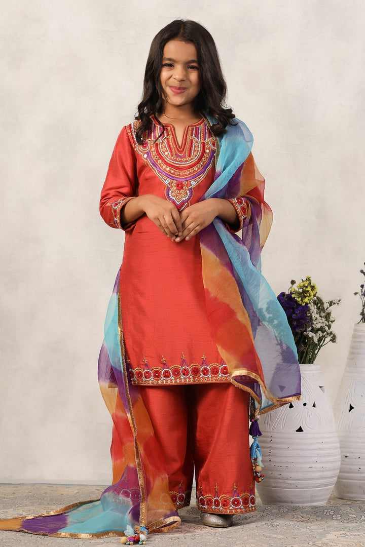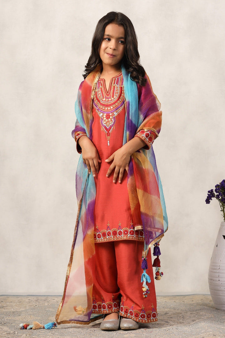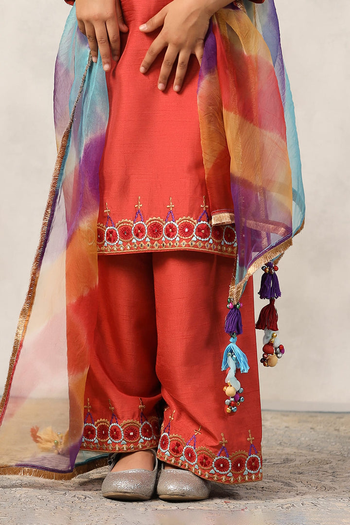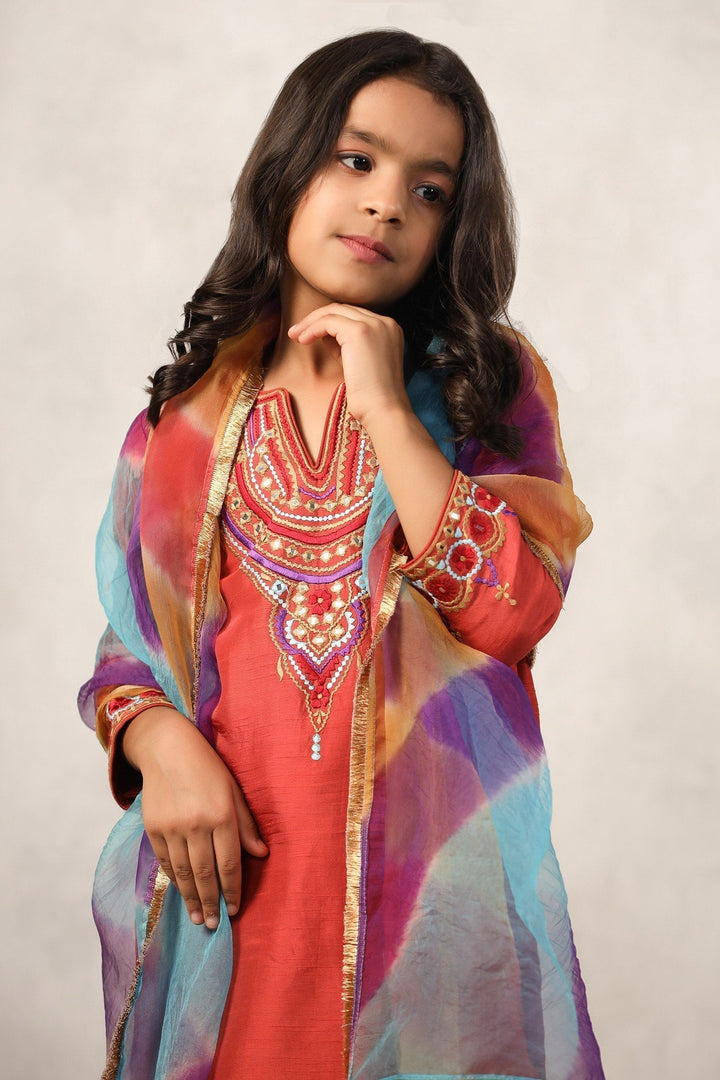 Red silk kurta with thread, mirror embroidery & tassel detailing. Paired with pant & dyed dupatta.