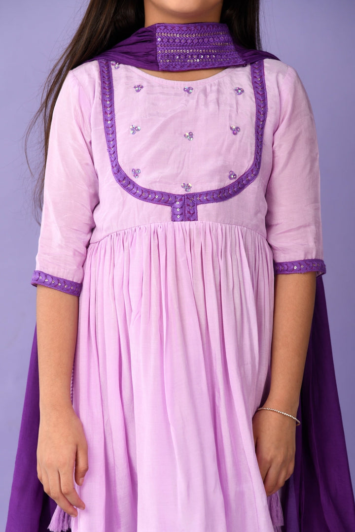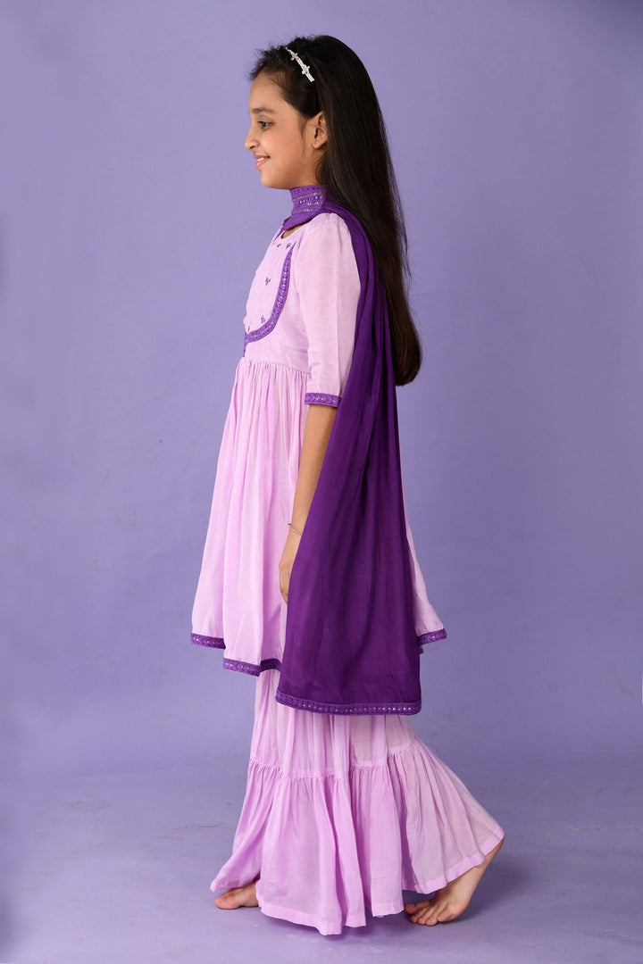 Purple Muslin Silk Embroidery Sequins Kurta Sharara Set For Girls
