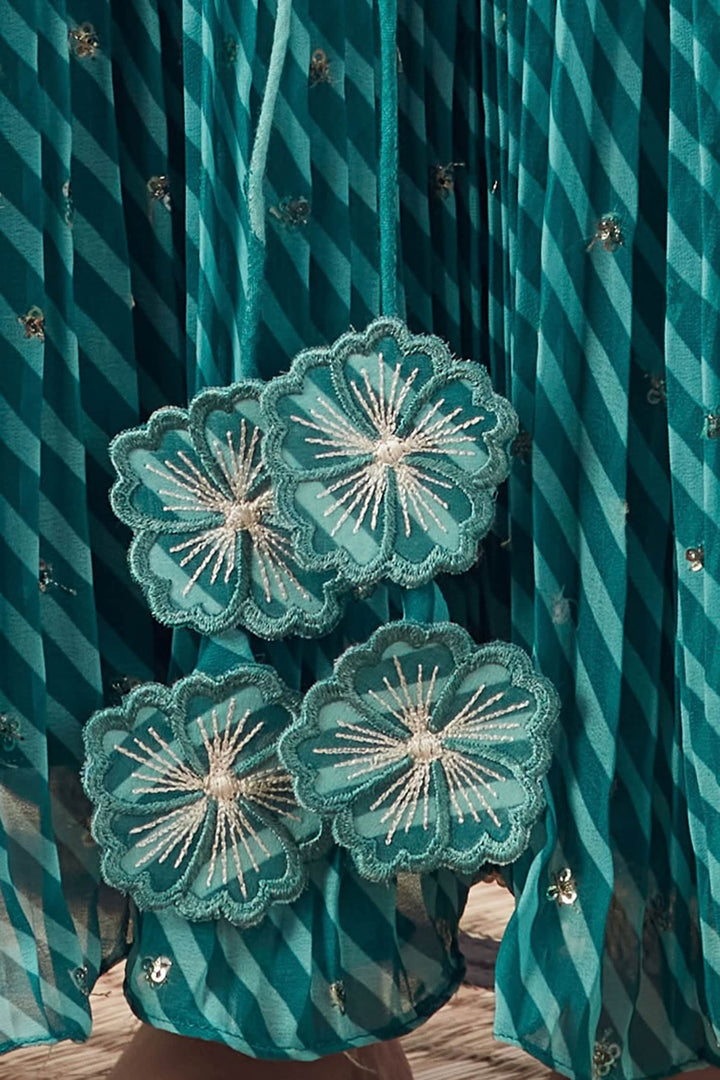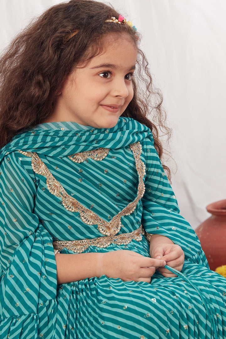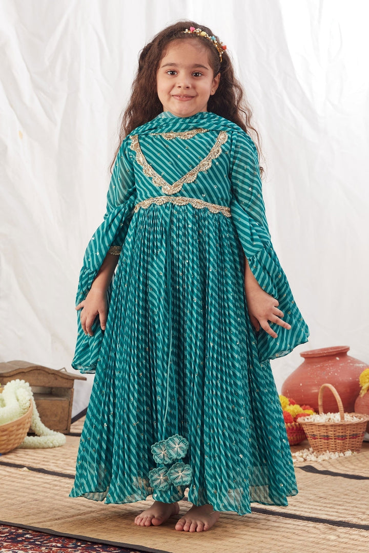 Turquoise chiffon pleated anarkali with leheriya stripe pattern, sequin work highlights & scalloped cut work gota lace details. Paired with stripe pattern ruffle bordered dupatta.