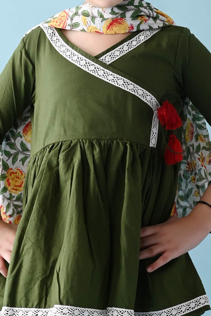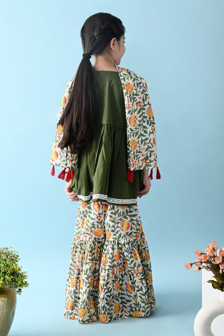 Green Cotton Plain Tisha Kurta Sharara Set For Girls