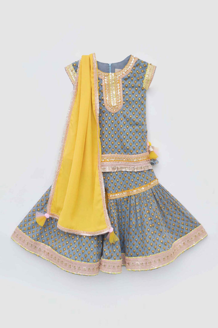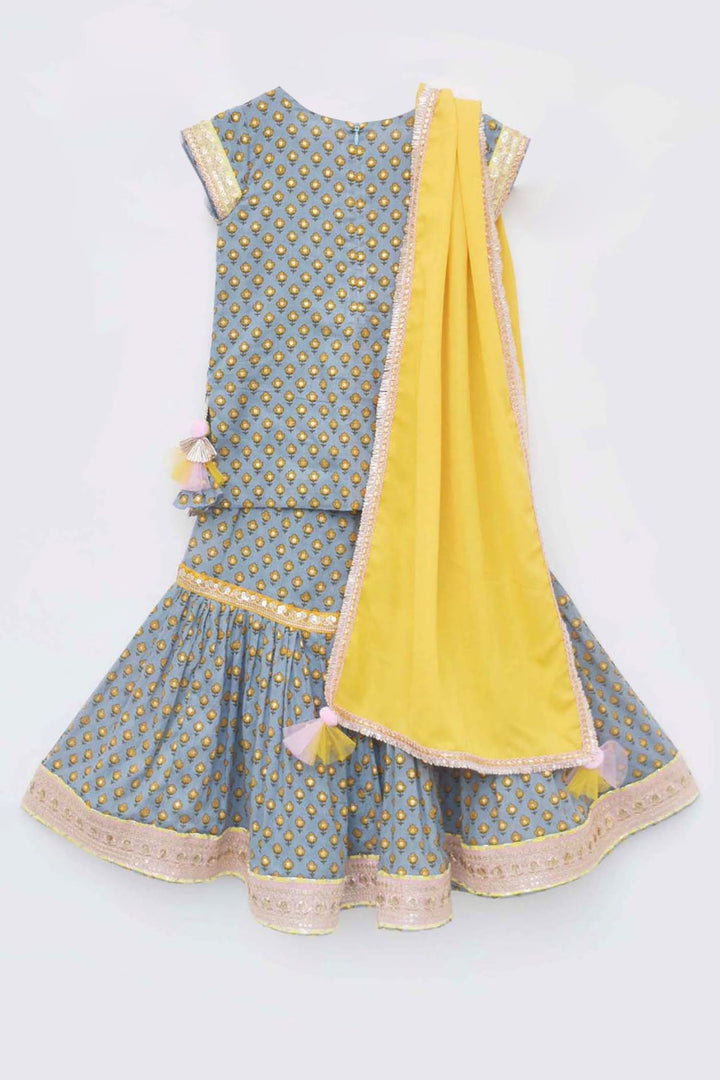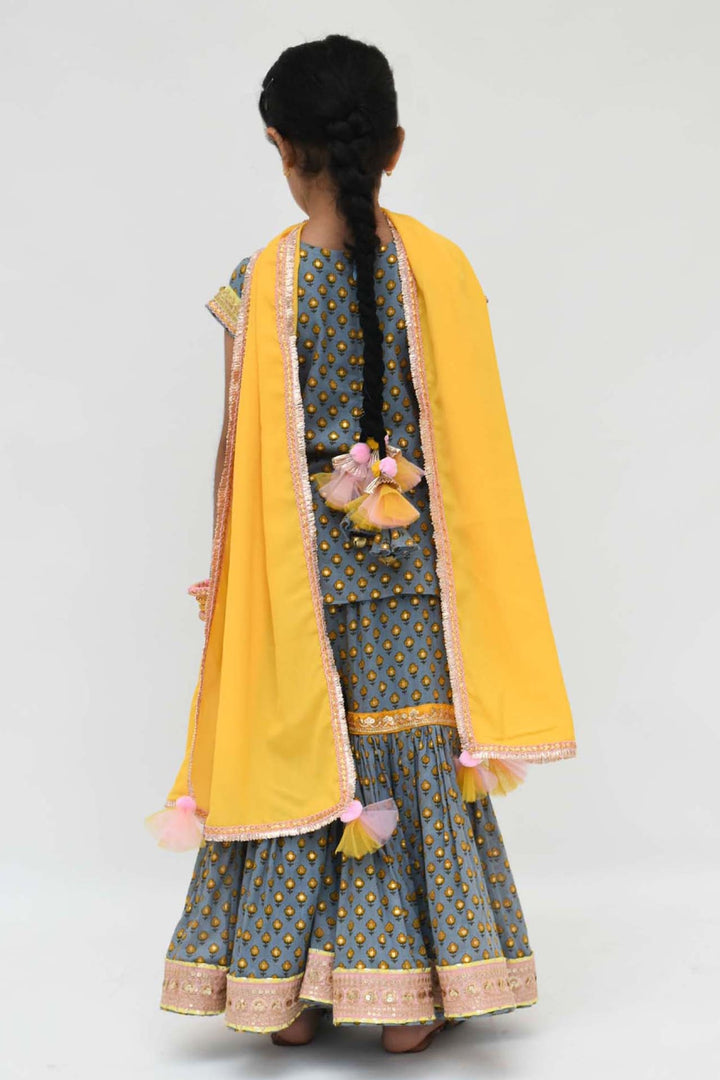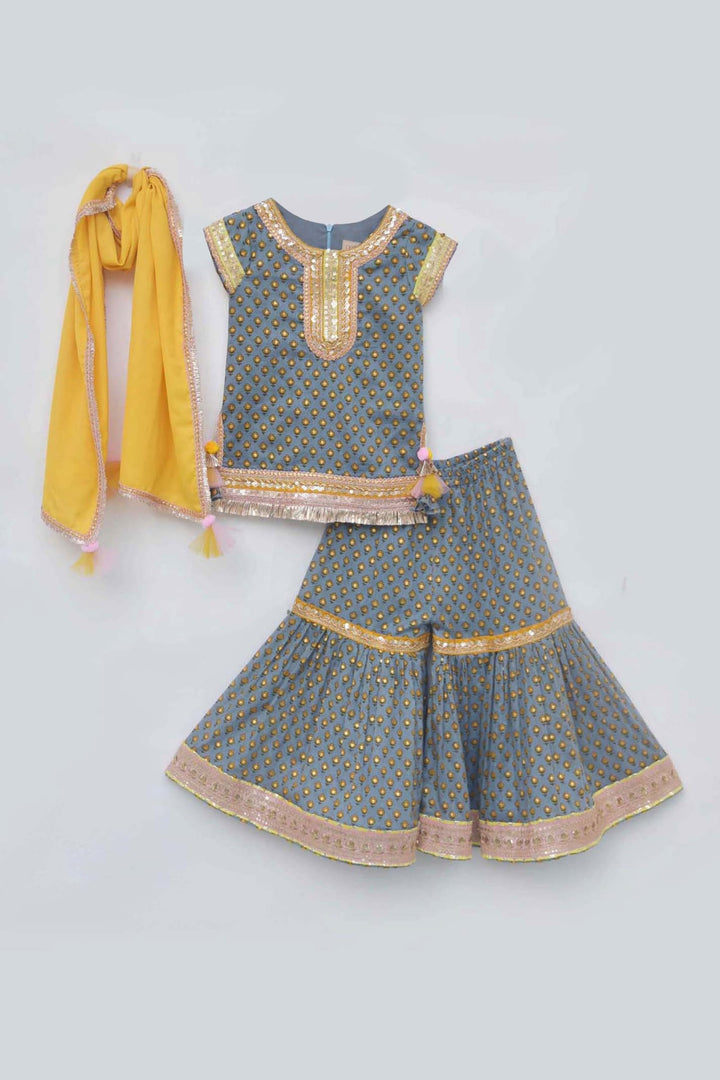 Grey Cotton And Georgette Printed Kurta & Sharara Set For Girls