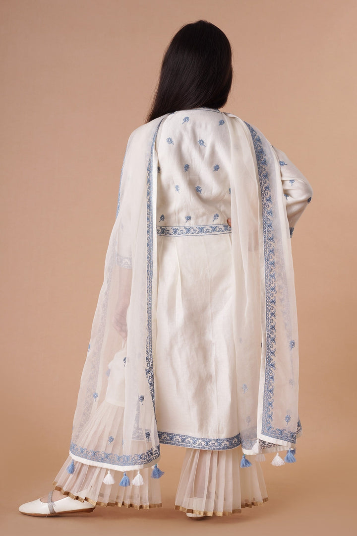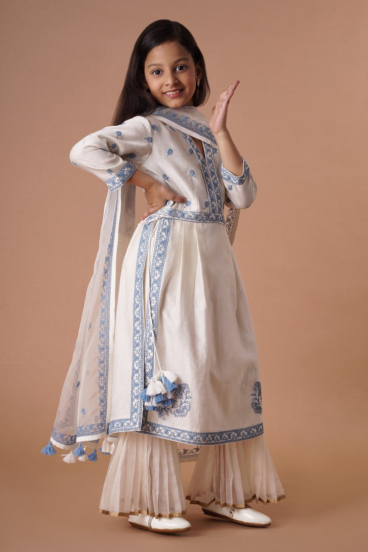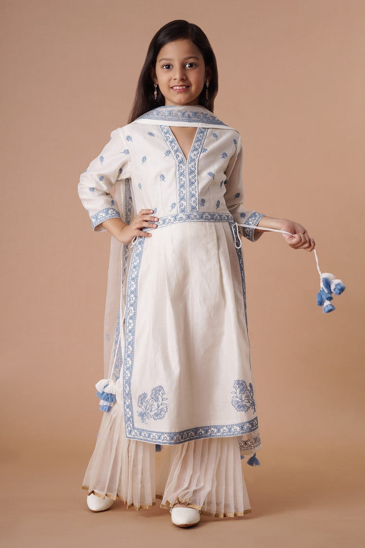 Ivory Chanderi Handloom Silk Embroidery Thread Kurta Sharara Set For Girls