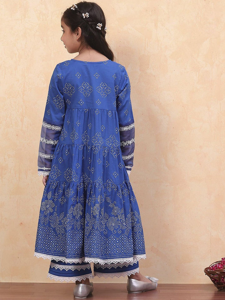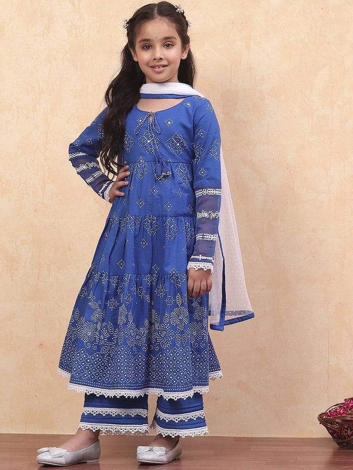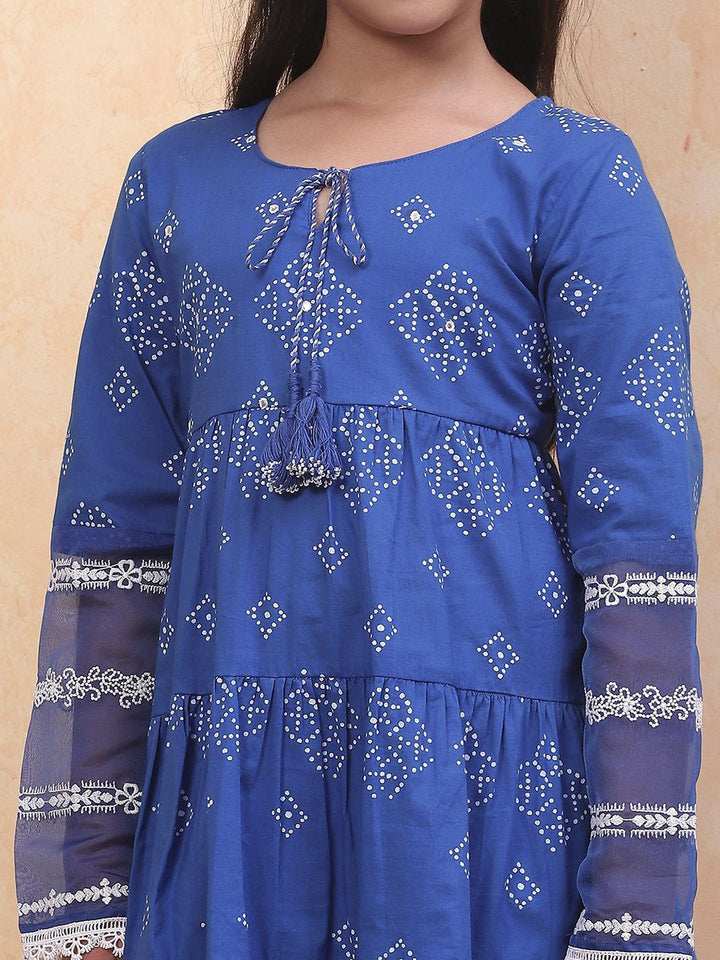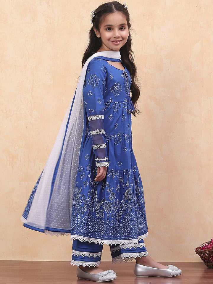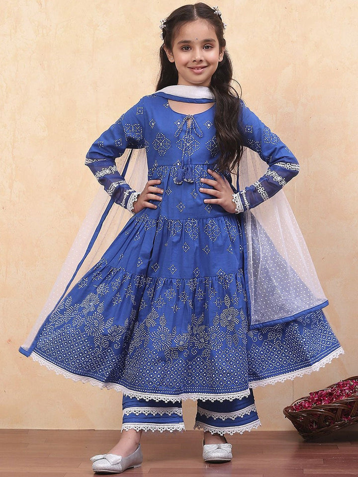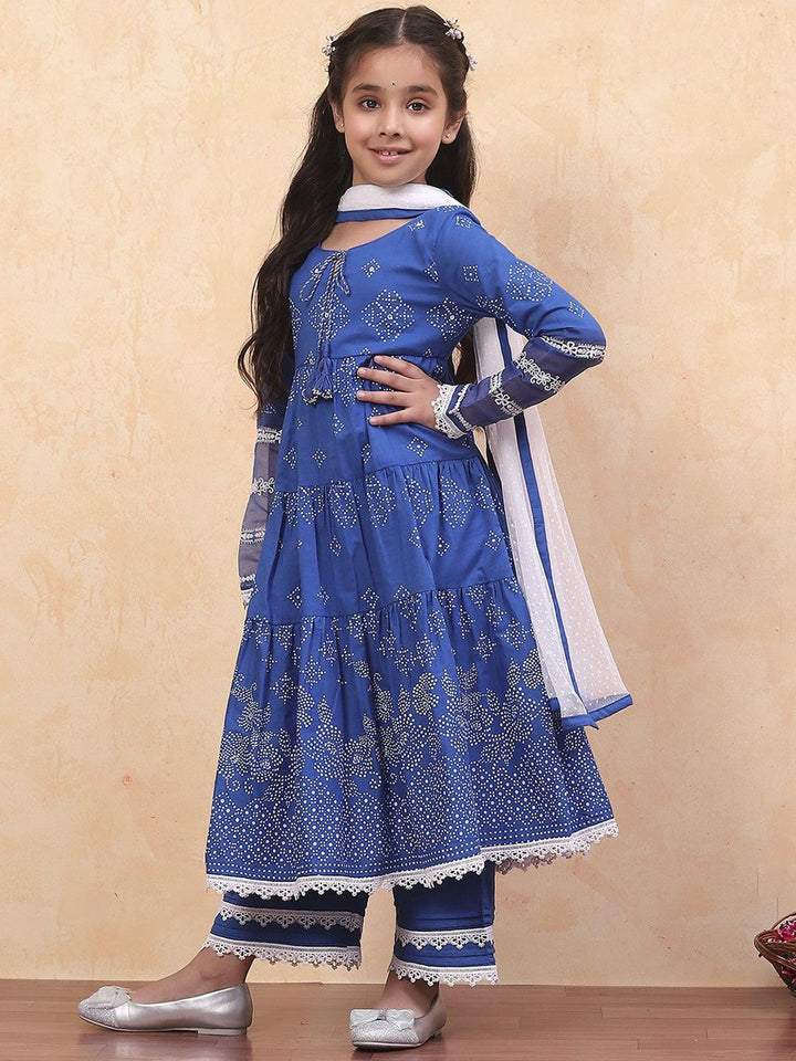 Girls Bandhani Printed Tie-Up Neck Pure Cotton Anarkali Kurta with Palazzos & Dupatta