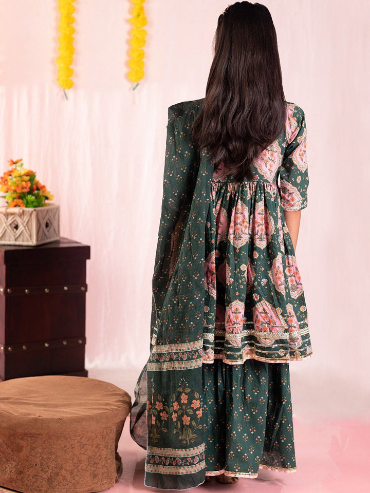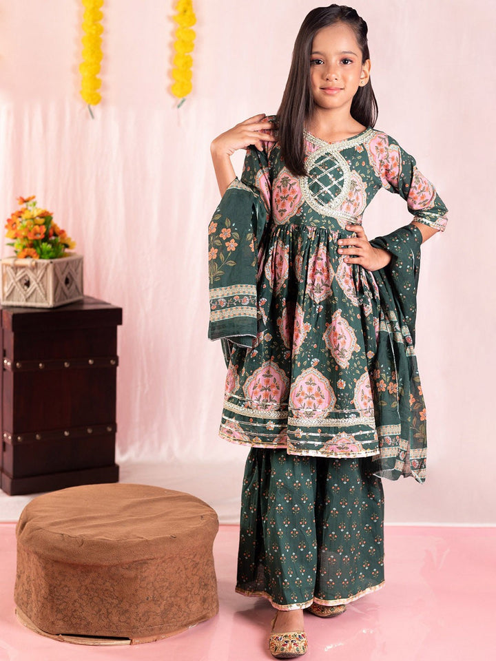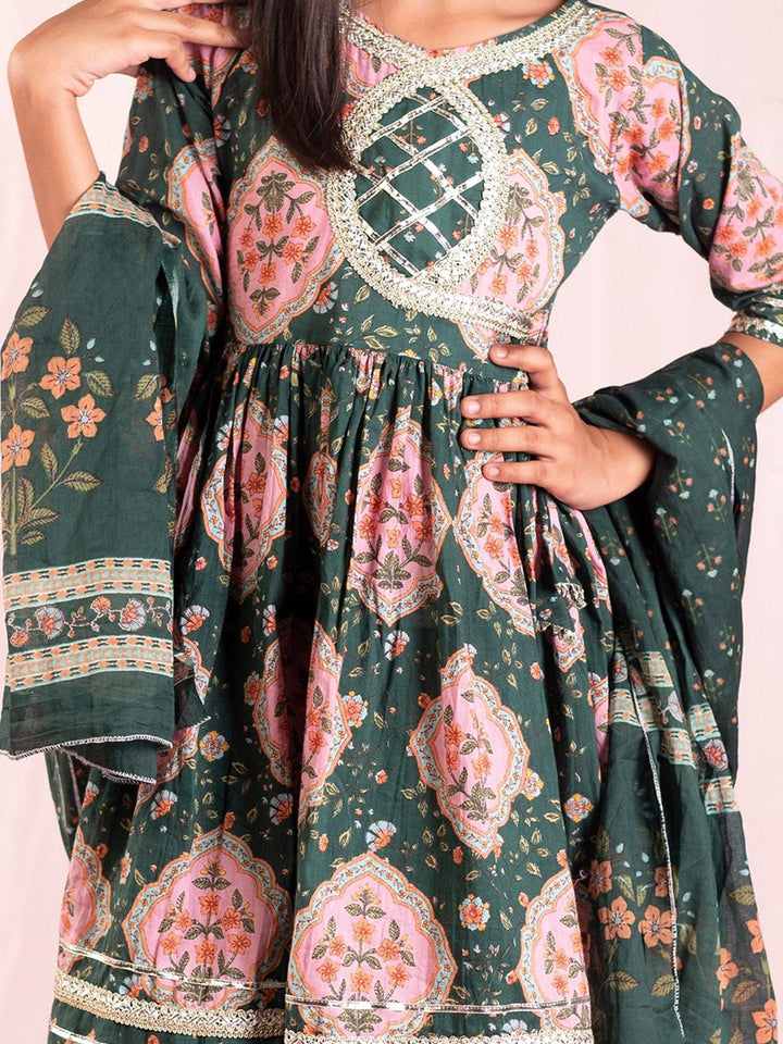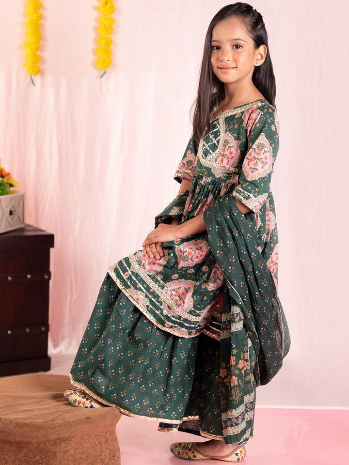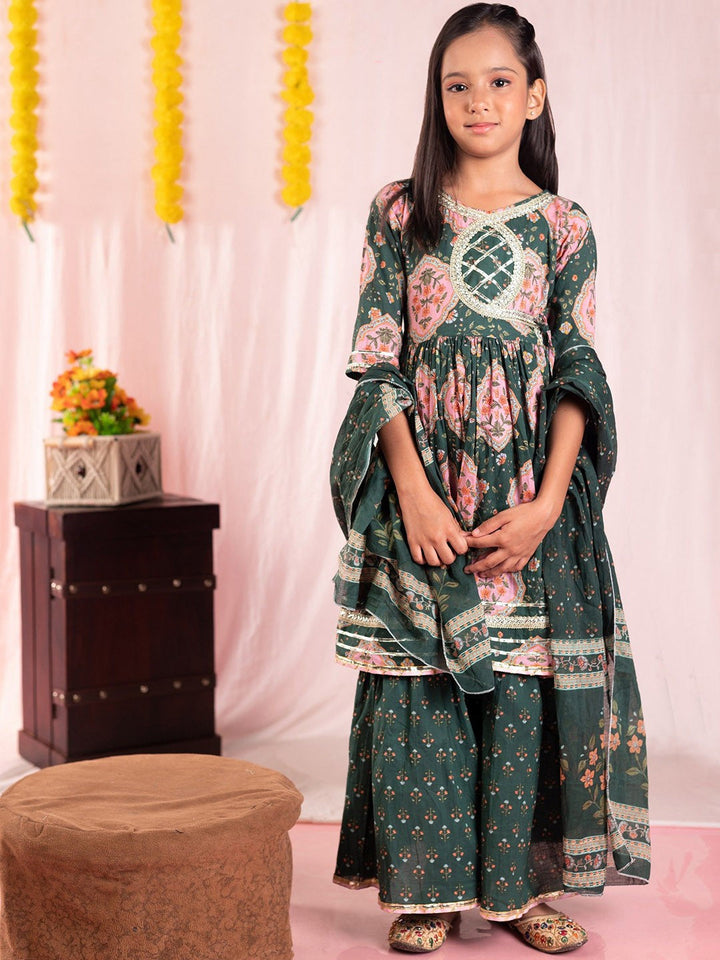 Girls Ethnic Motifs Embroidered Pure Cotton Kurta with Sharara & Dupatta