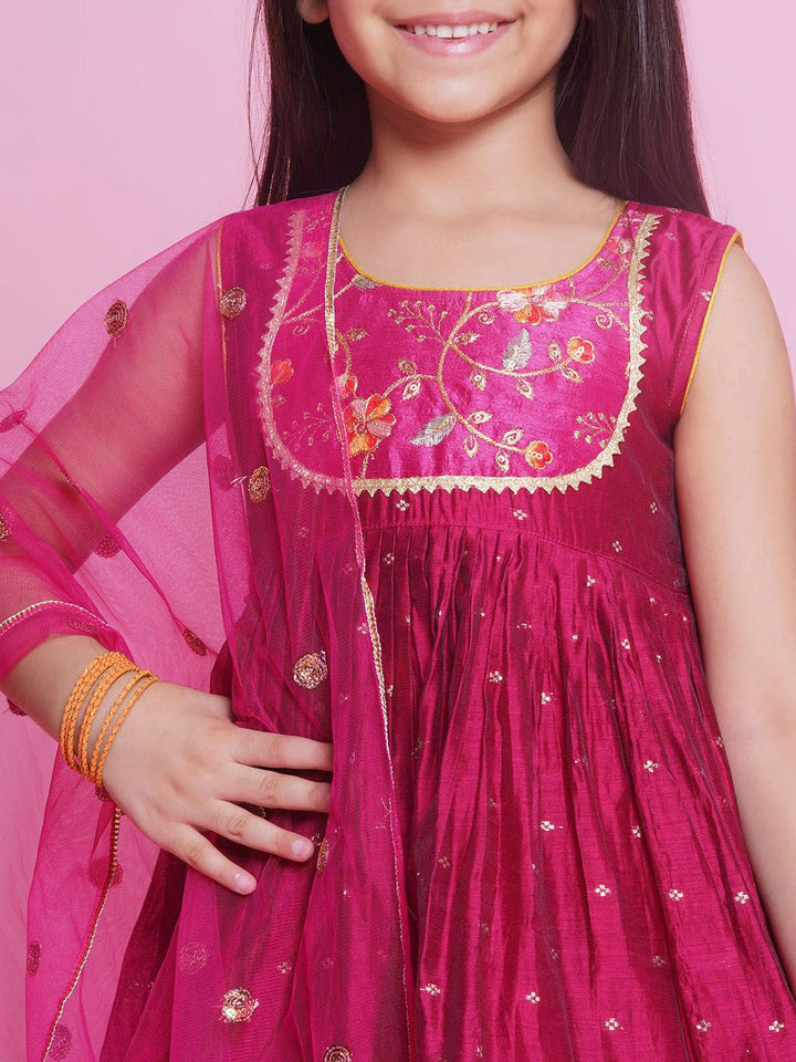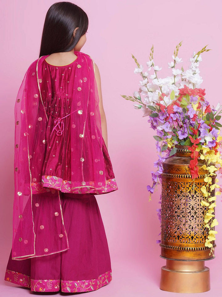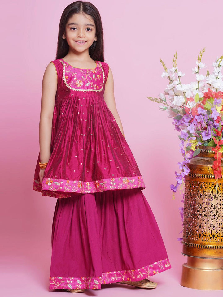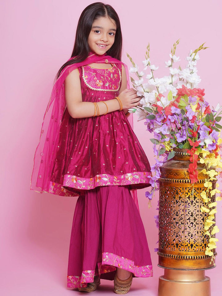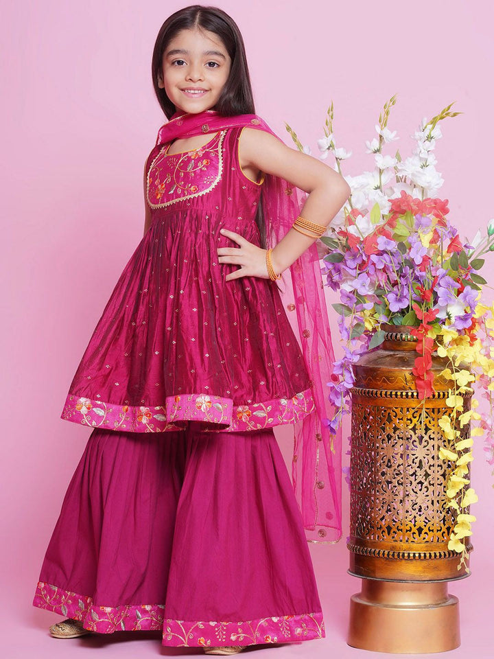 Girls Ethnic Motifs Embroidered Pure Silk Kurta With Sharara & Dupatta