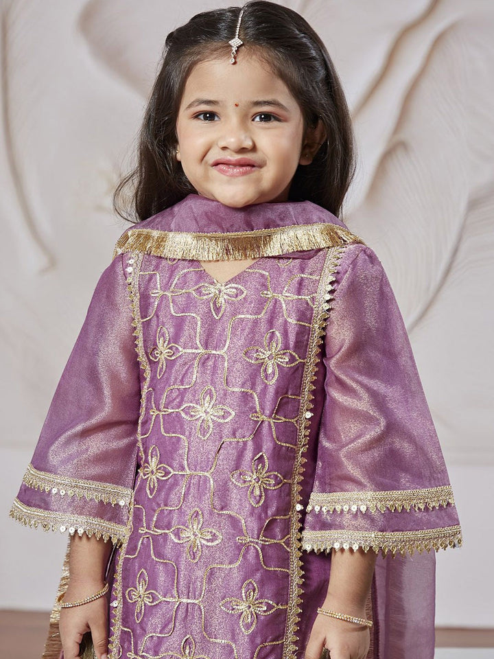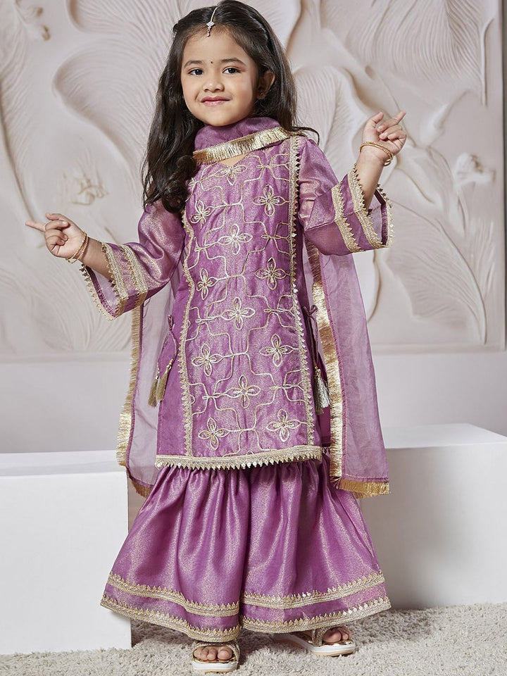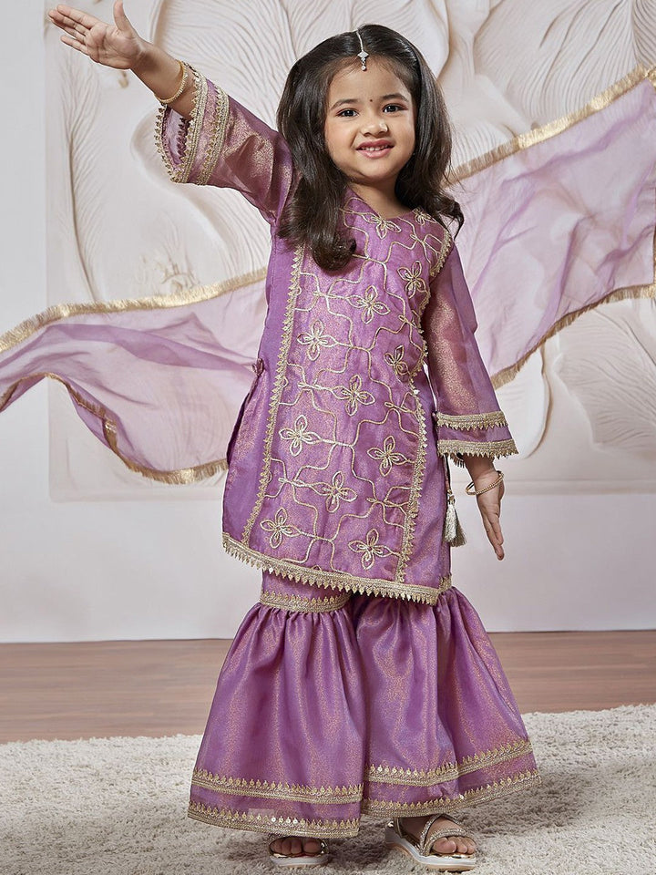 Girls Floral Embroidered Regular Sequinned Tissue Kurta & Sharara With Dupatta