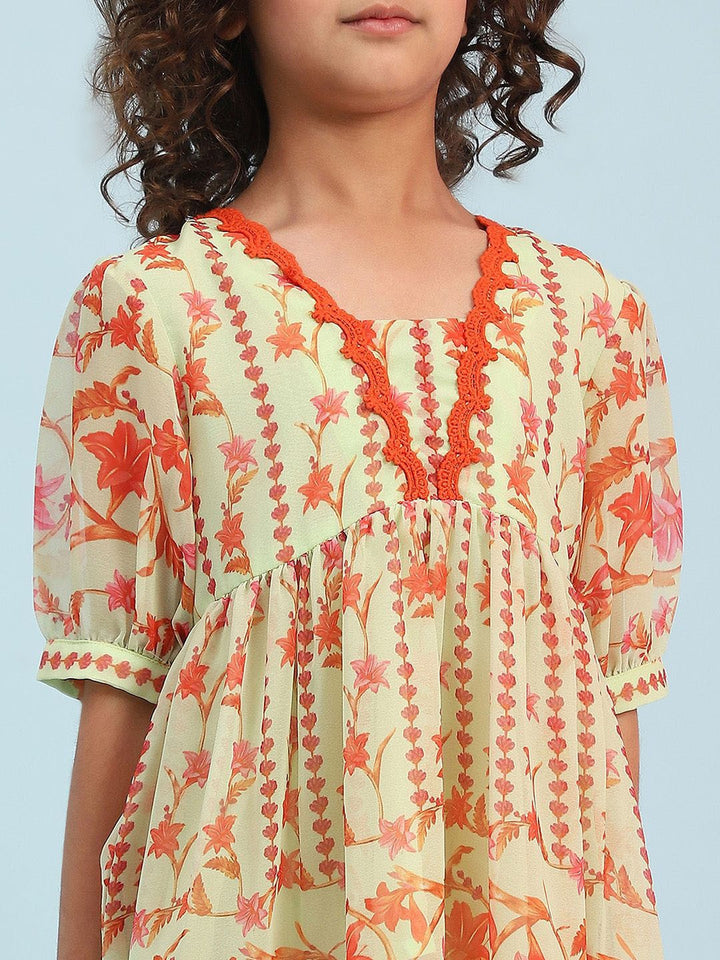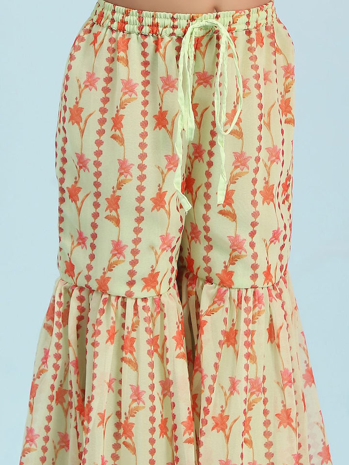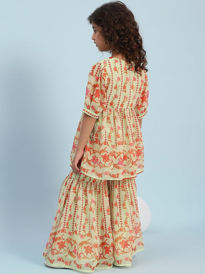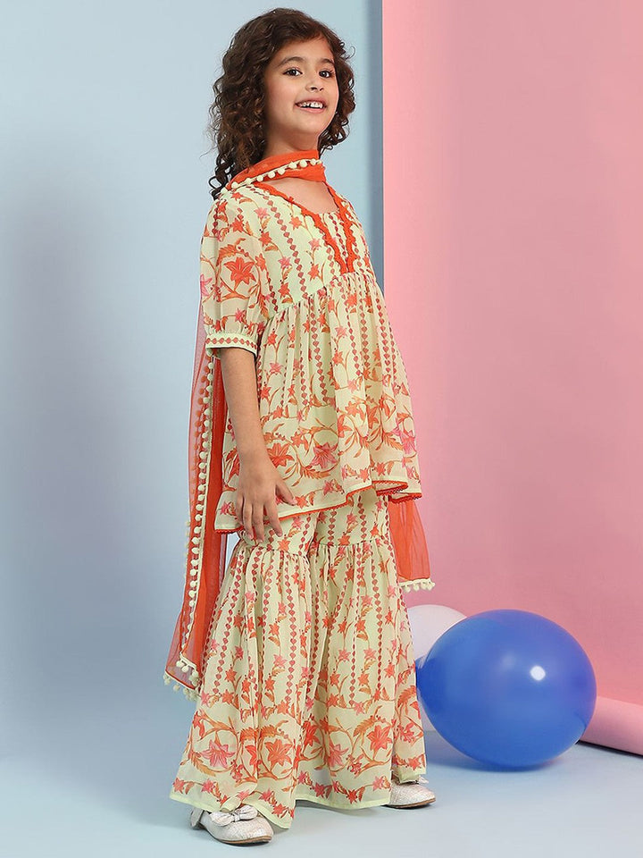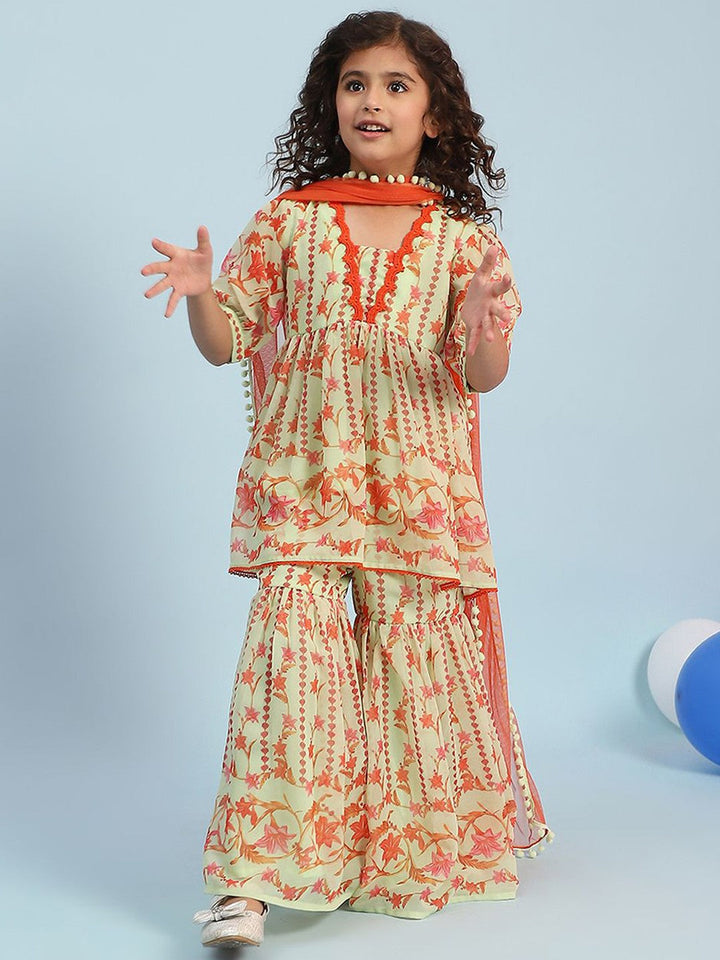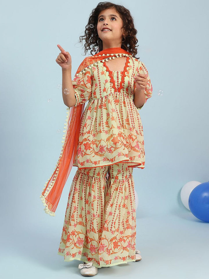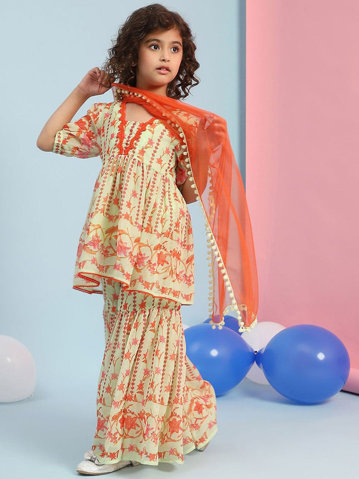 Girls Floral Printed A-Line Kurti with Sharara & Dupatta