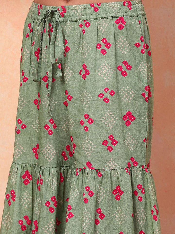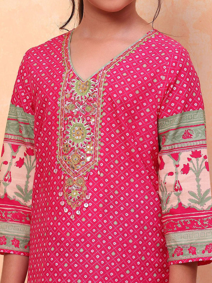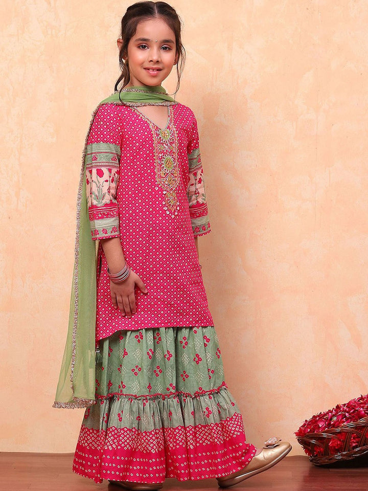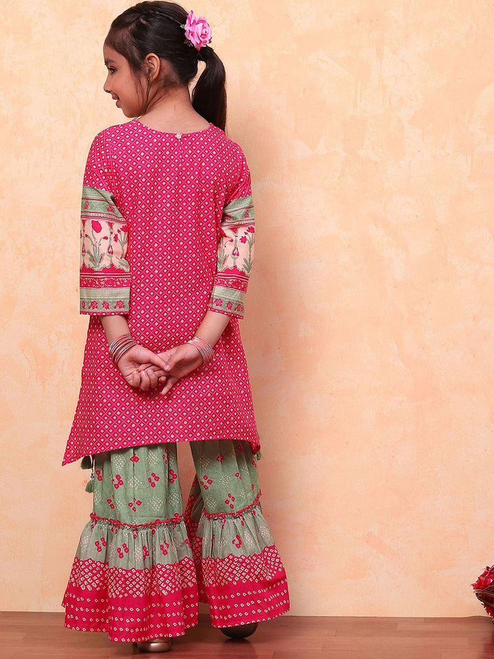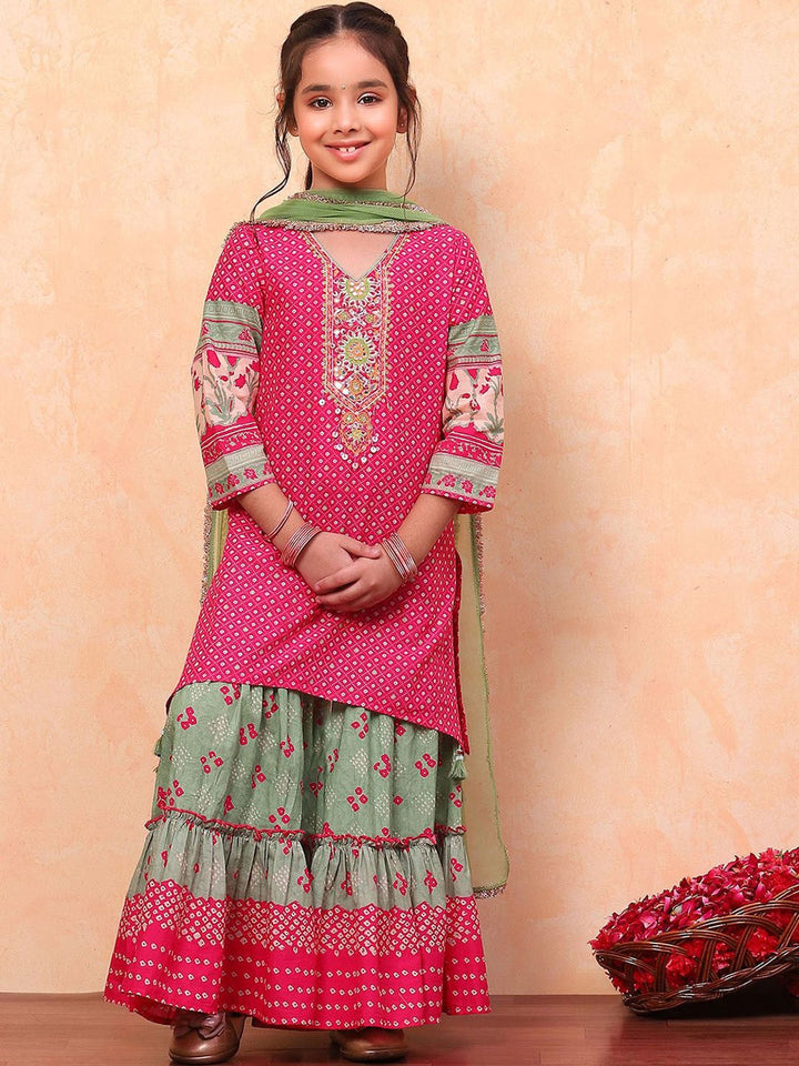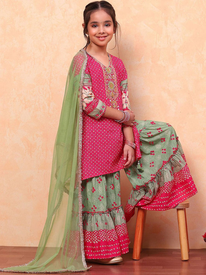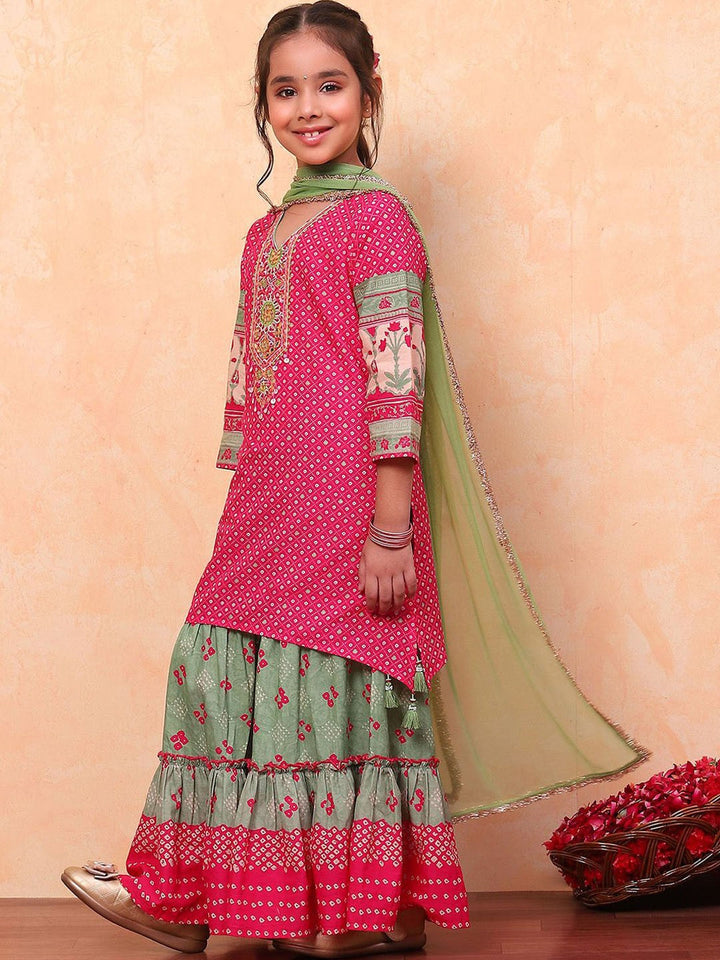 Girls Floral Printed Angrakha Pure Cotton Kurta With Sharara & Dupatta