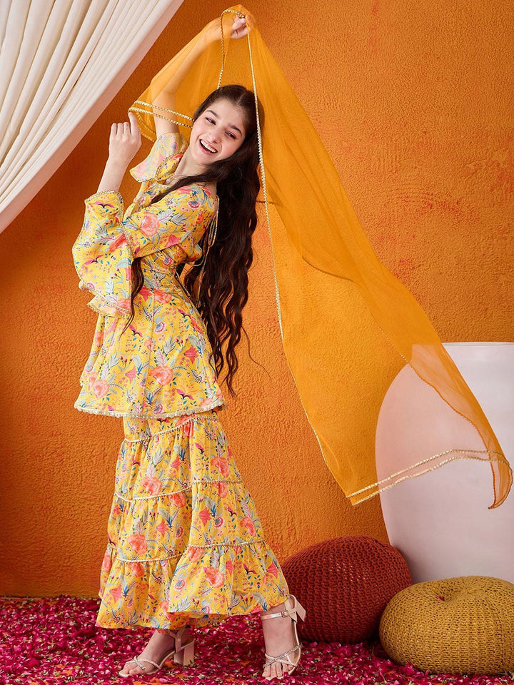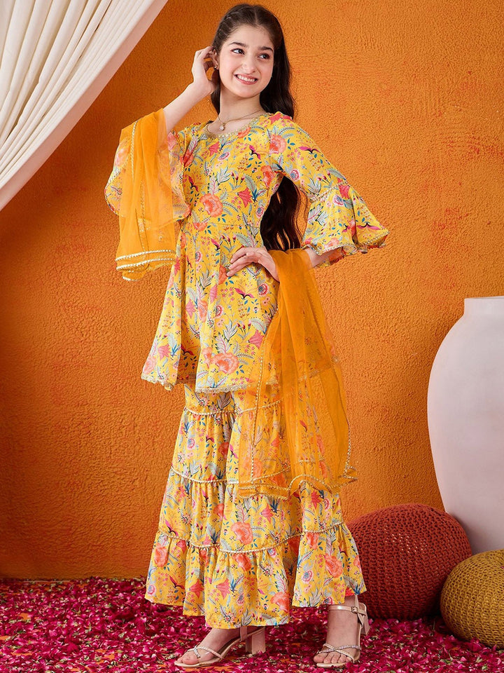 Girls Floral Printed Empire Gotta Patti A-Line Kurti With Sharara & Dupatta