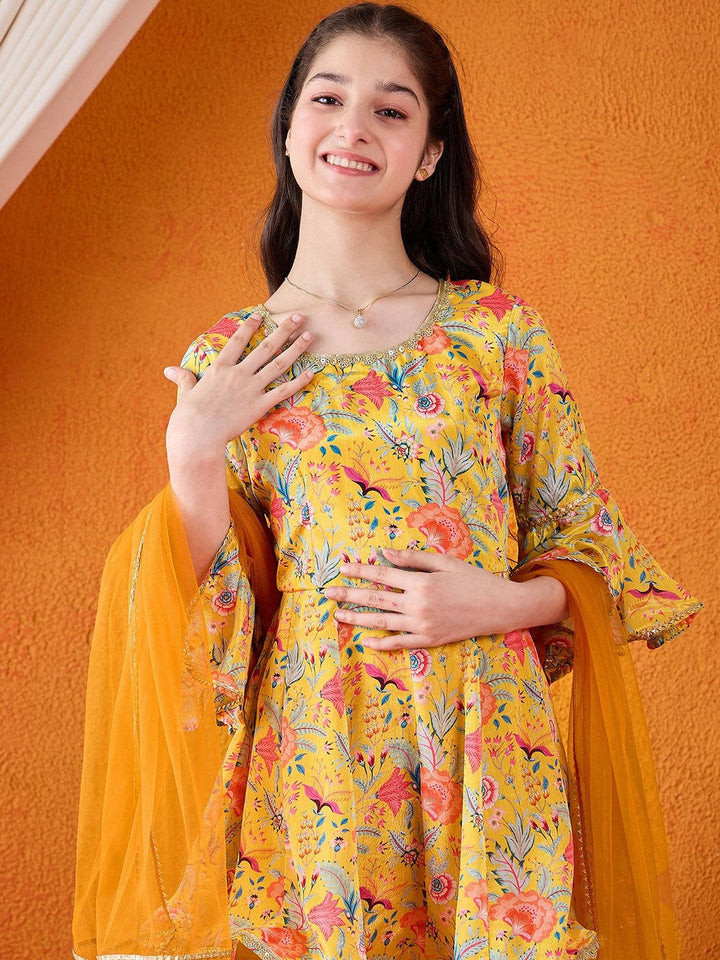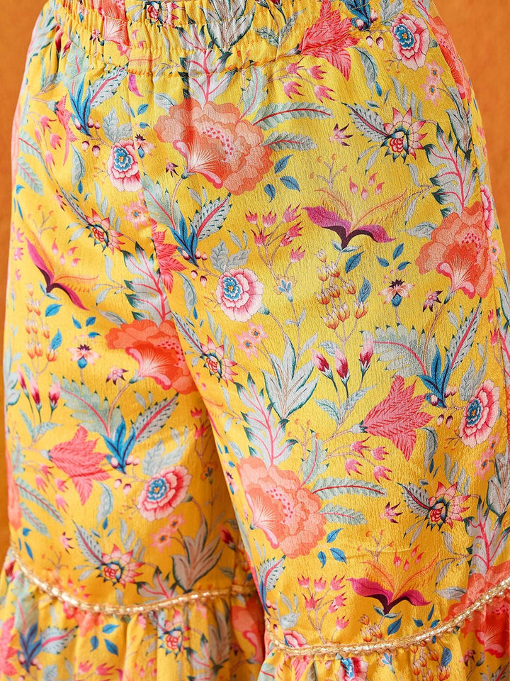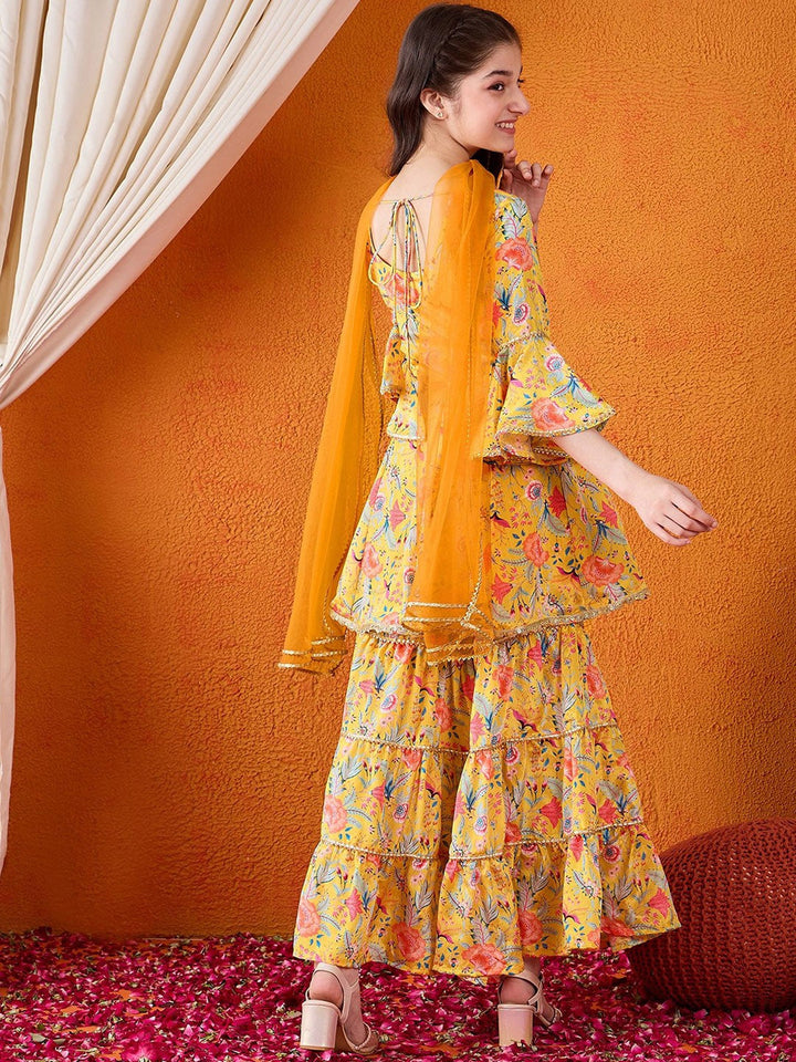 Girls Floral Printed Empire Gotta Patti A-Line Kurti With Sharara & Dupatta