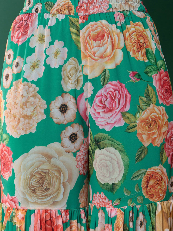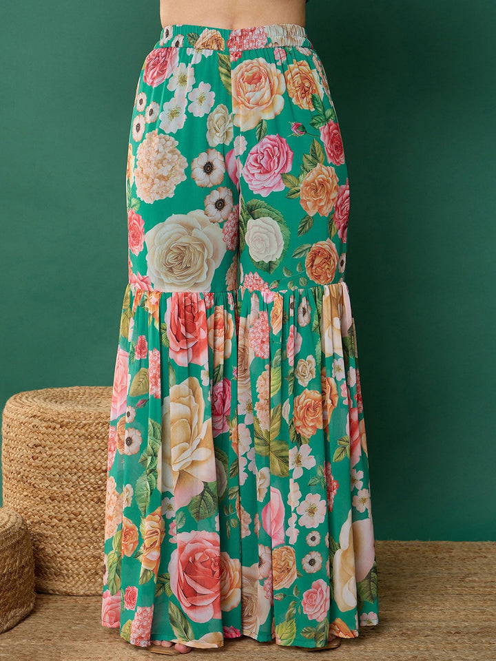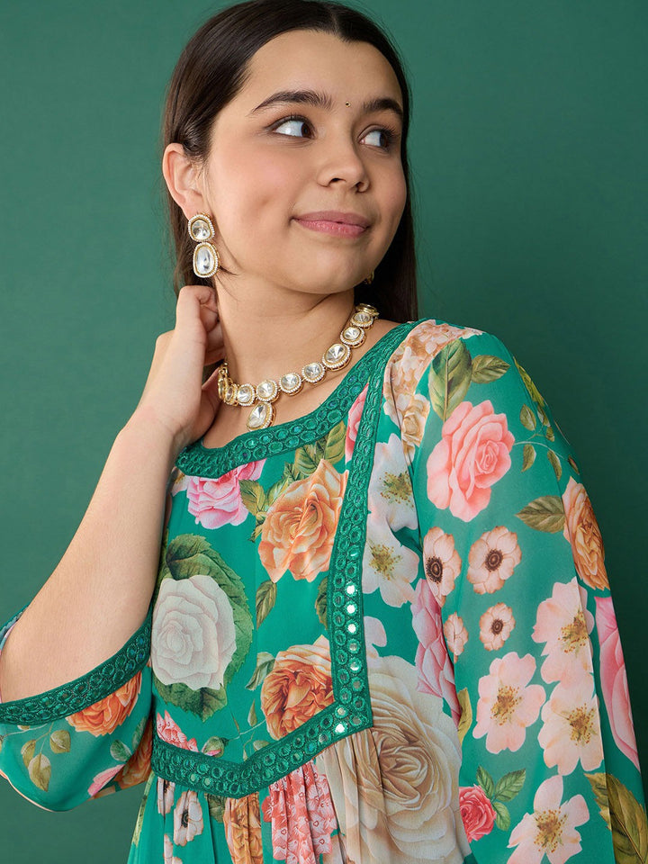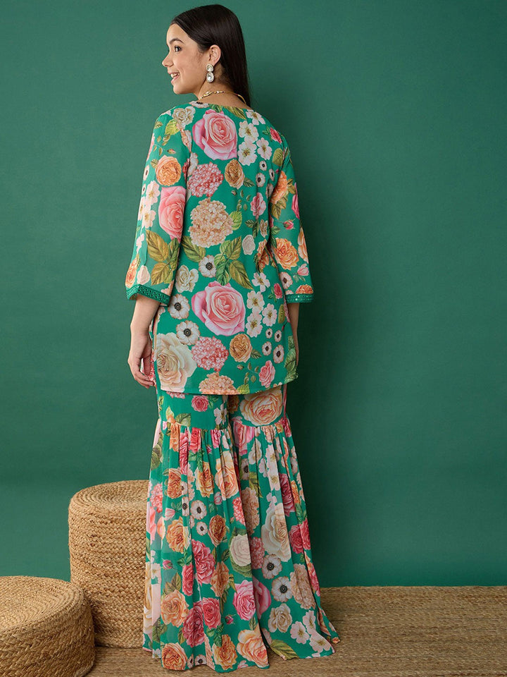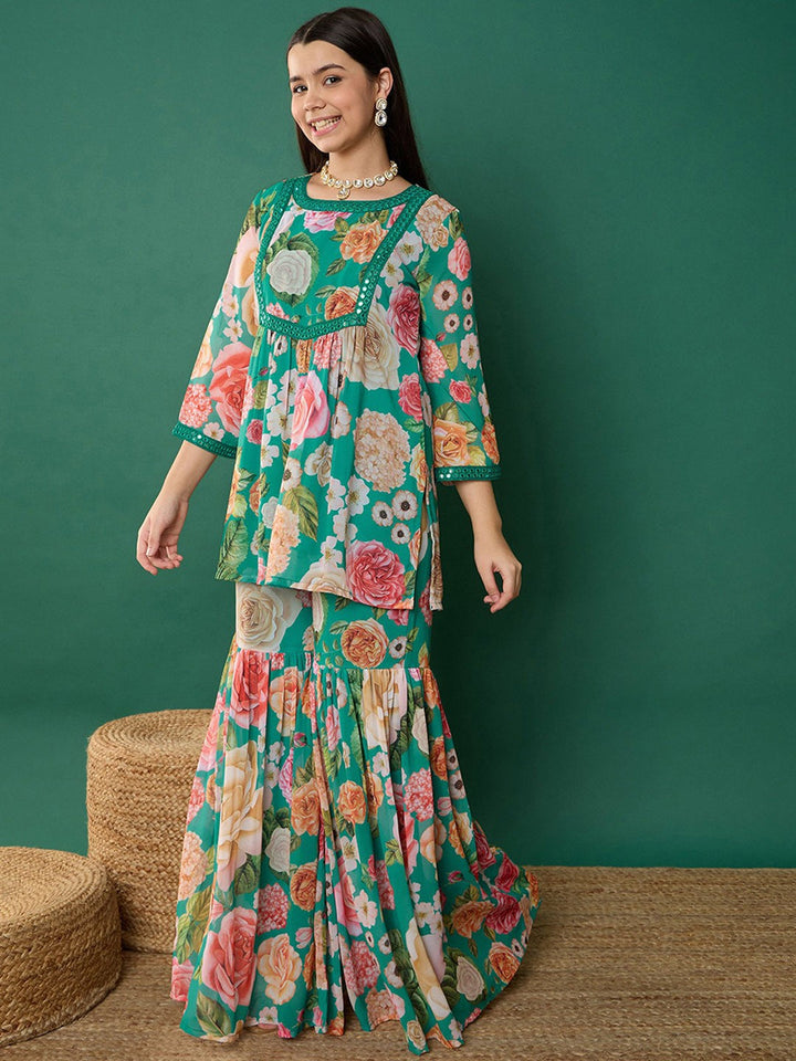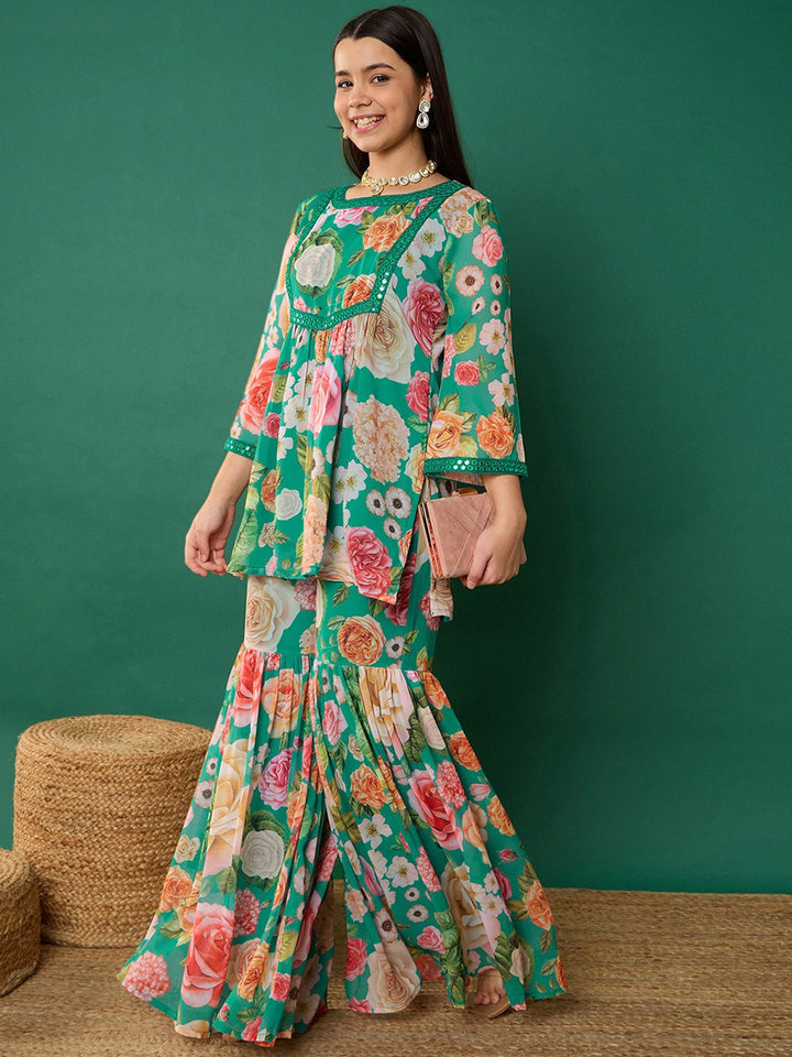 Girls Floral Printed Mirror Work Straight Kurti With Sharara