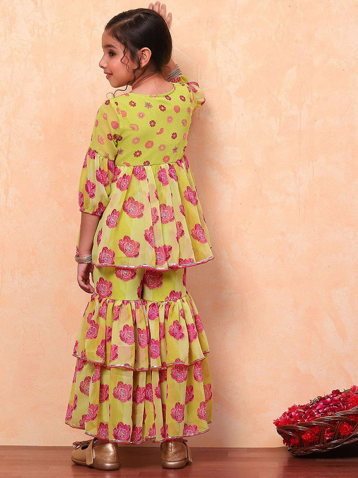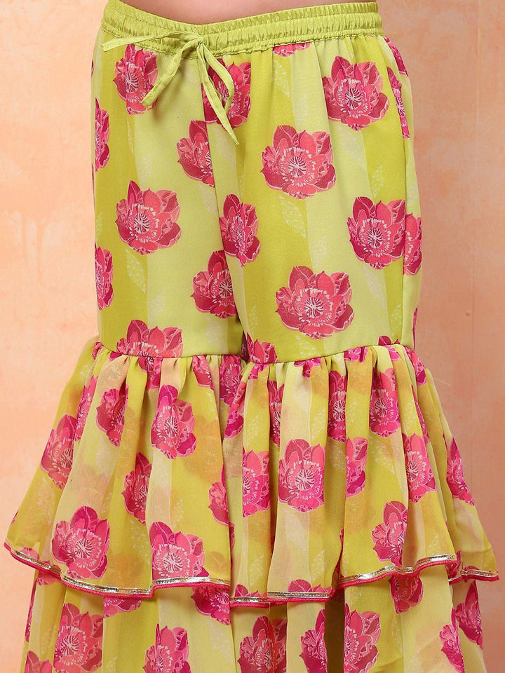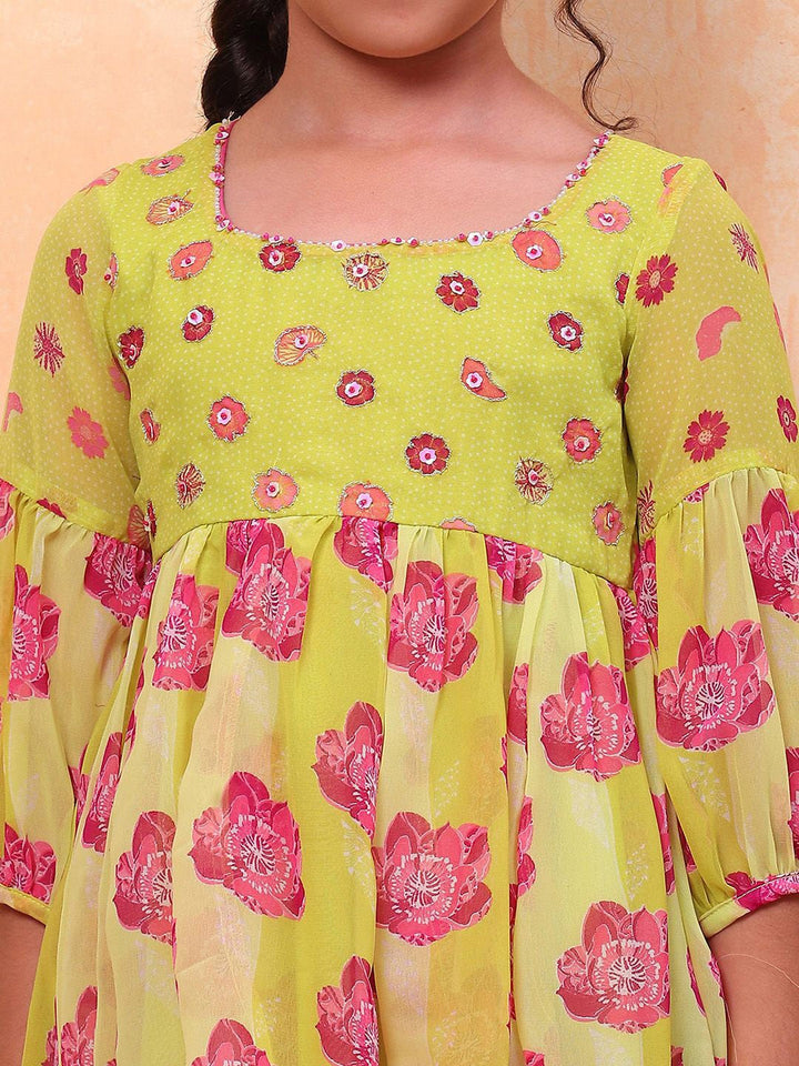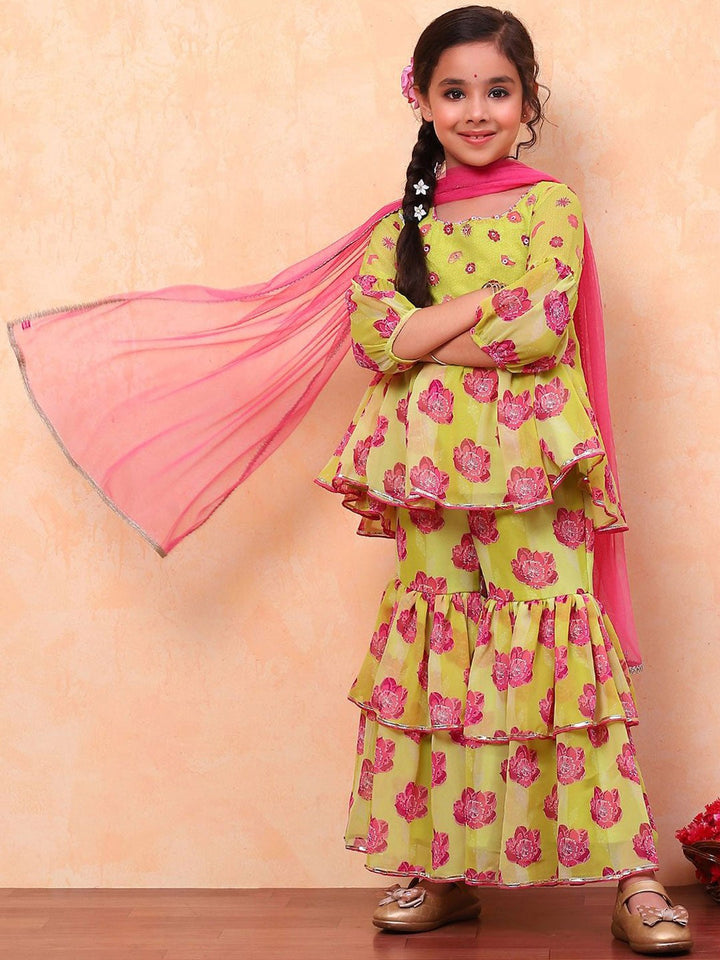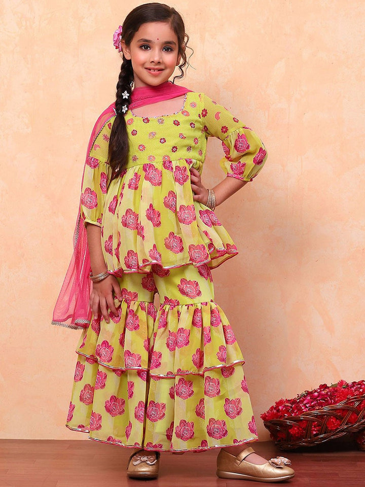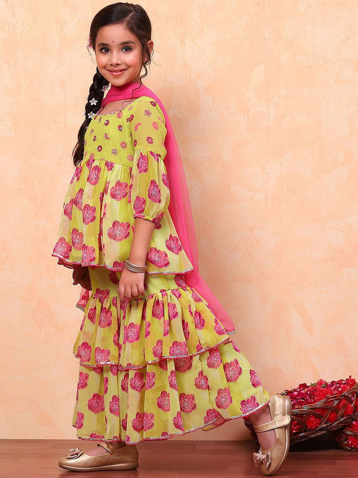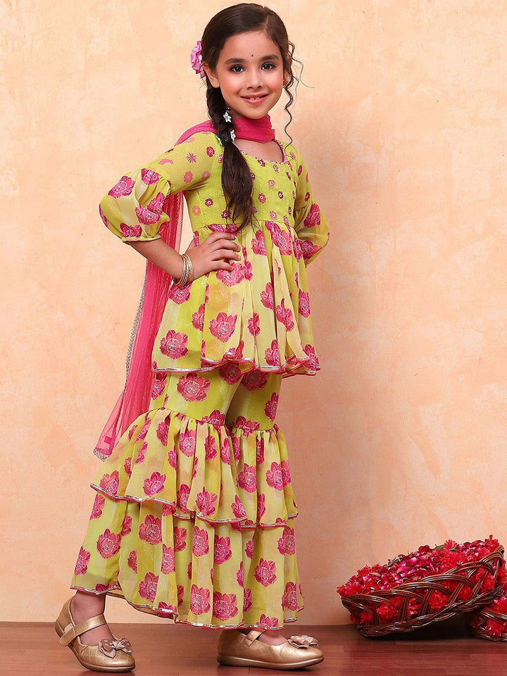 Girls Floral Printed Round Neck Anarkali Kurta with Sharara & Dupatta