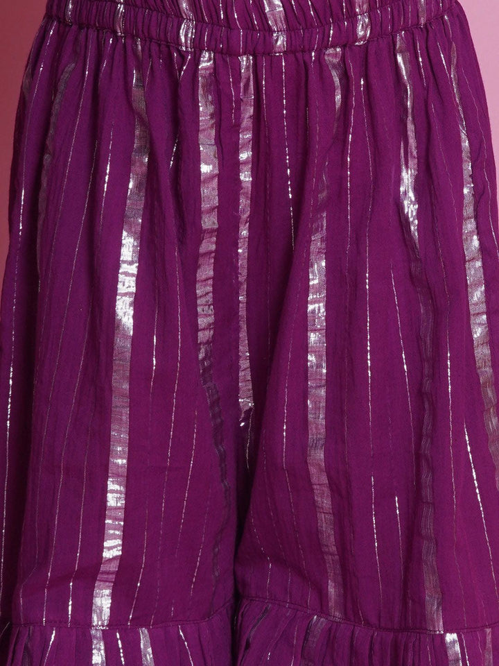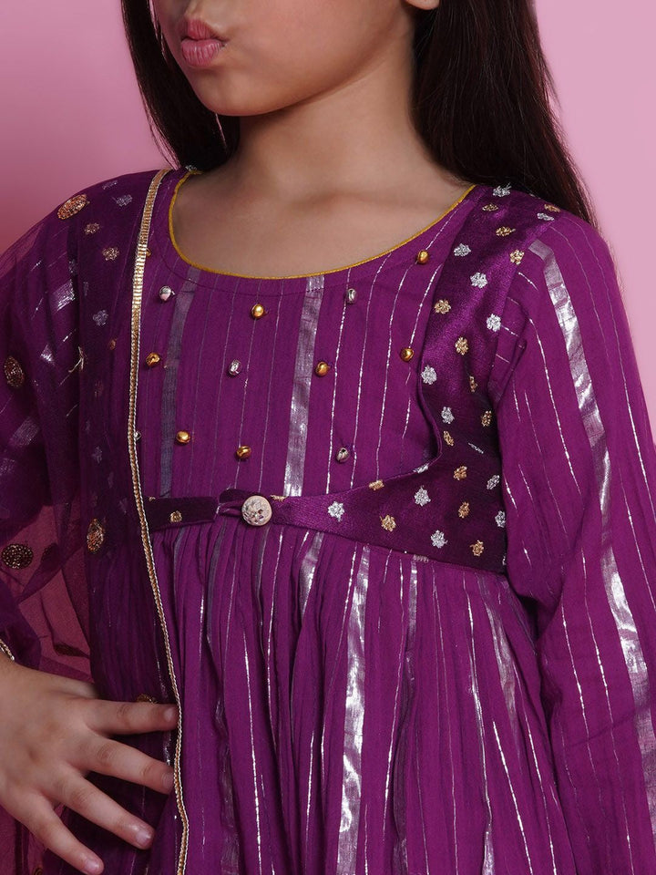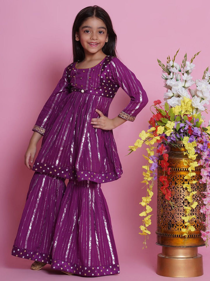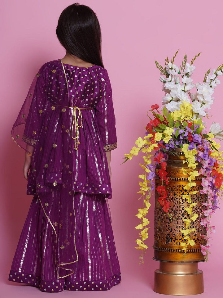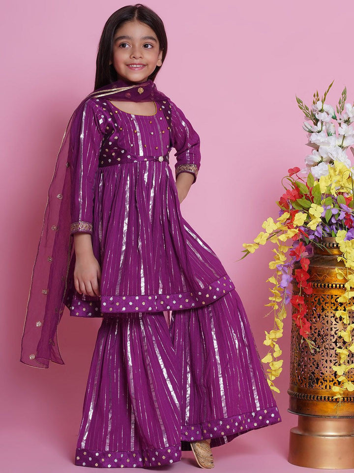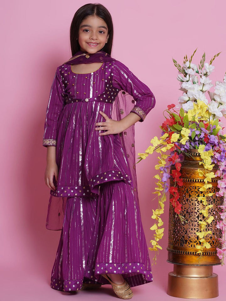 Girls Striped Pure Cotton Kurta With Sharara & Dupatta