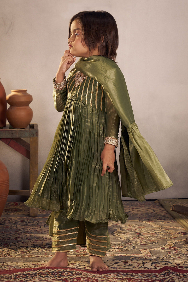 Green Tissue Lining Crepe Embellished Accordion Pleated Anarkali Set