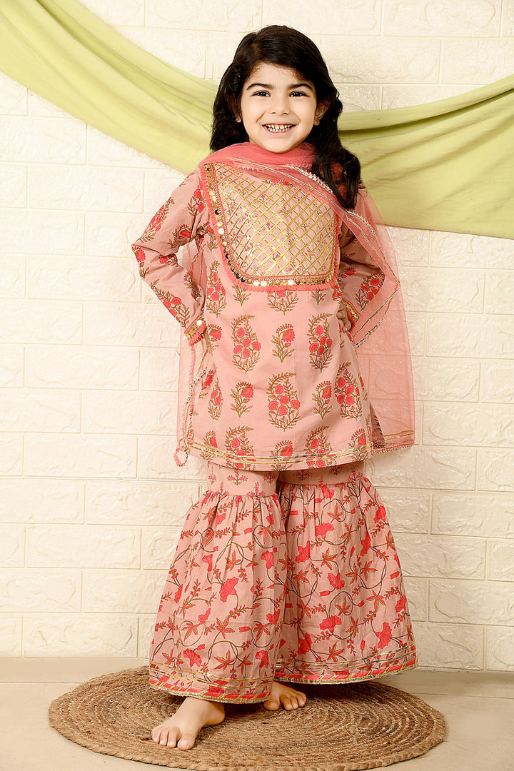 Pink Cotton Floral Garden Pattern Kurta Sharara Set