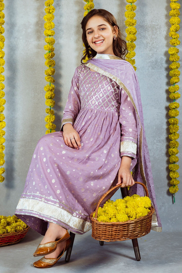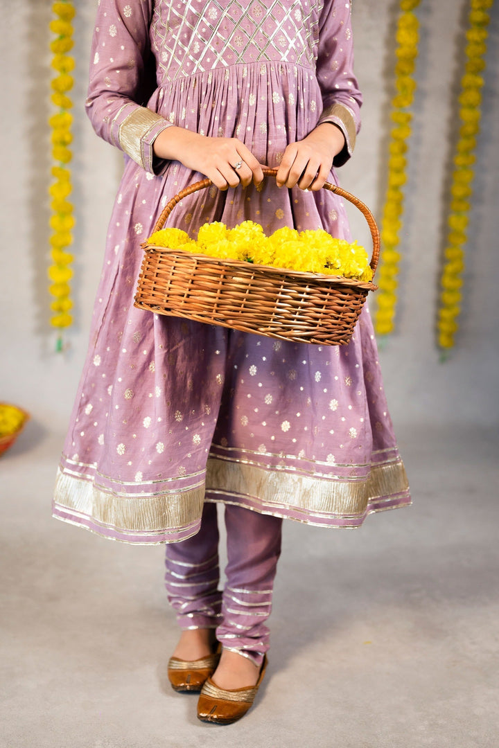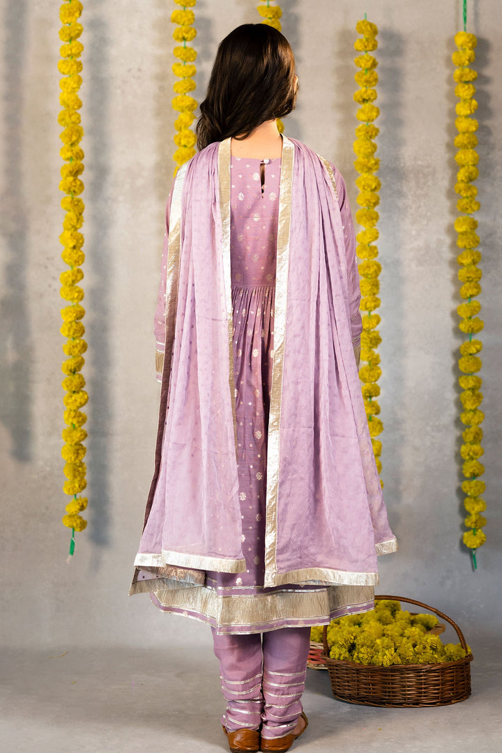 Purple Cotton Woven Floral Trellis Pattern Yoke Anarkali Set