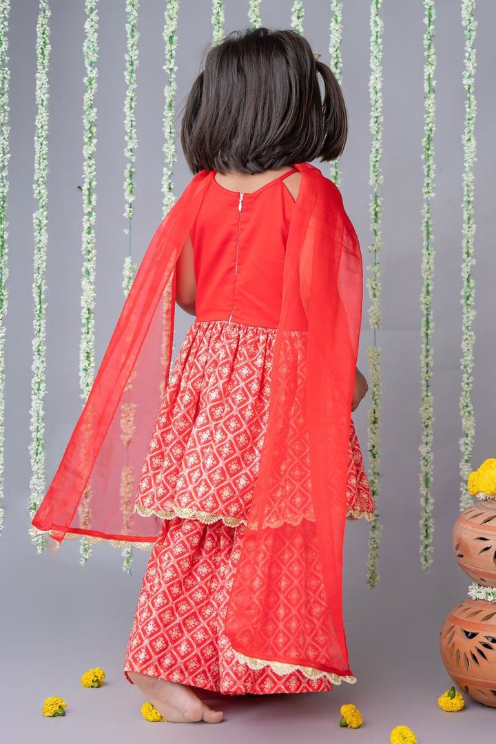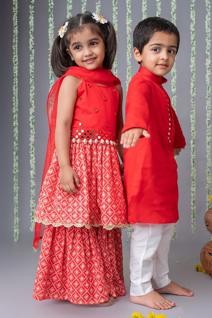 Red Cotton Satin Embroidered Mirror Kurta Sharara Set